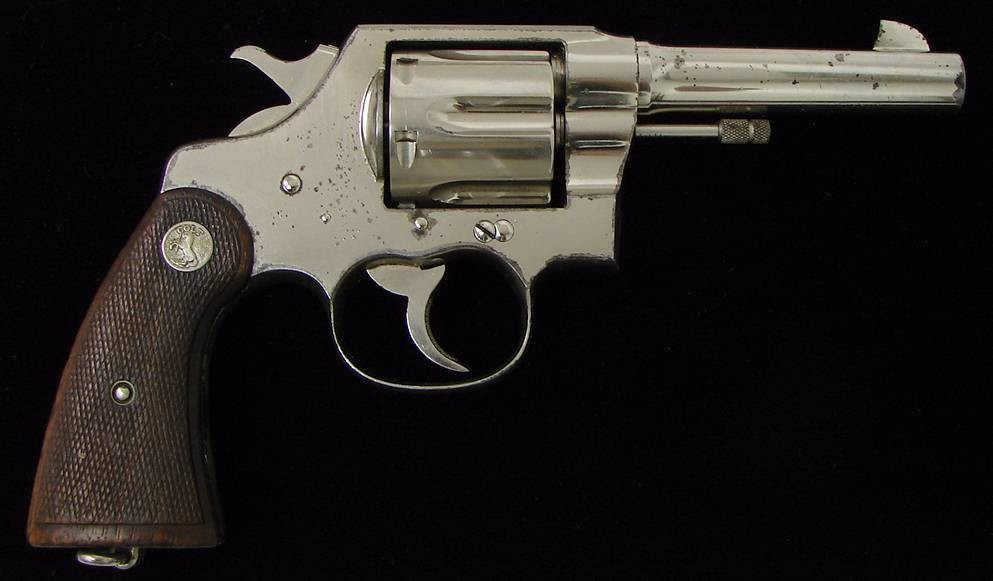 Colt New Service .45 Colt caliber revolver manufactured 1939. Factory nickel finish with 94-95% remaining. (Has some flaking on (c6825)