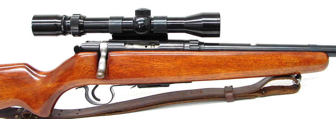 Savage 322-A .22 Hornet caliber rifle. Early model bolt action sporter with clip magazine. The stock has been re-finished with a high gloss and a Winchester pad has been added. Excellent condition with Bushnell 3x9 scope and leather sling. Great caliber.
