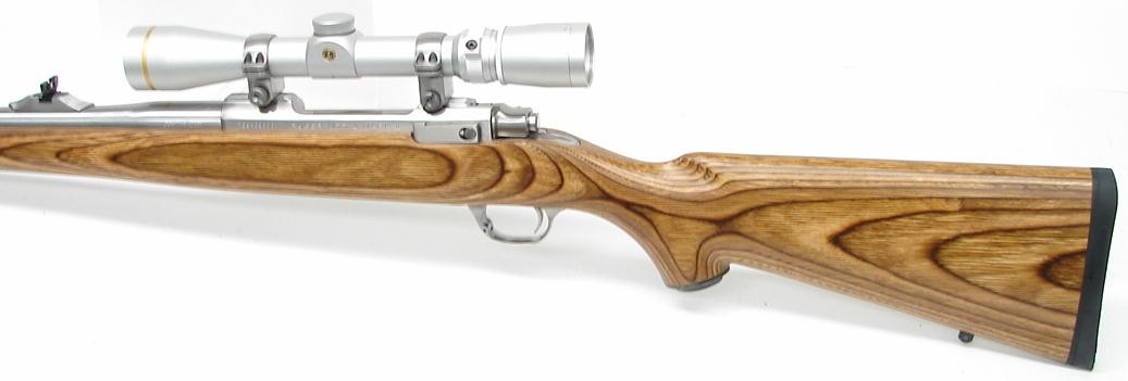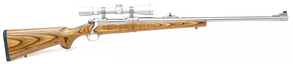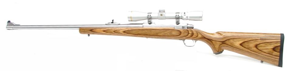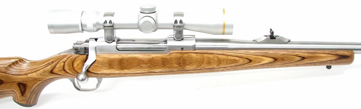 Ruger M77 Mark II .338 Win Magnum caliber rifle. Stainless laminated Magnum rifle with iron sights and Leupold 2.5 x 8 scope. Excellent condition.