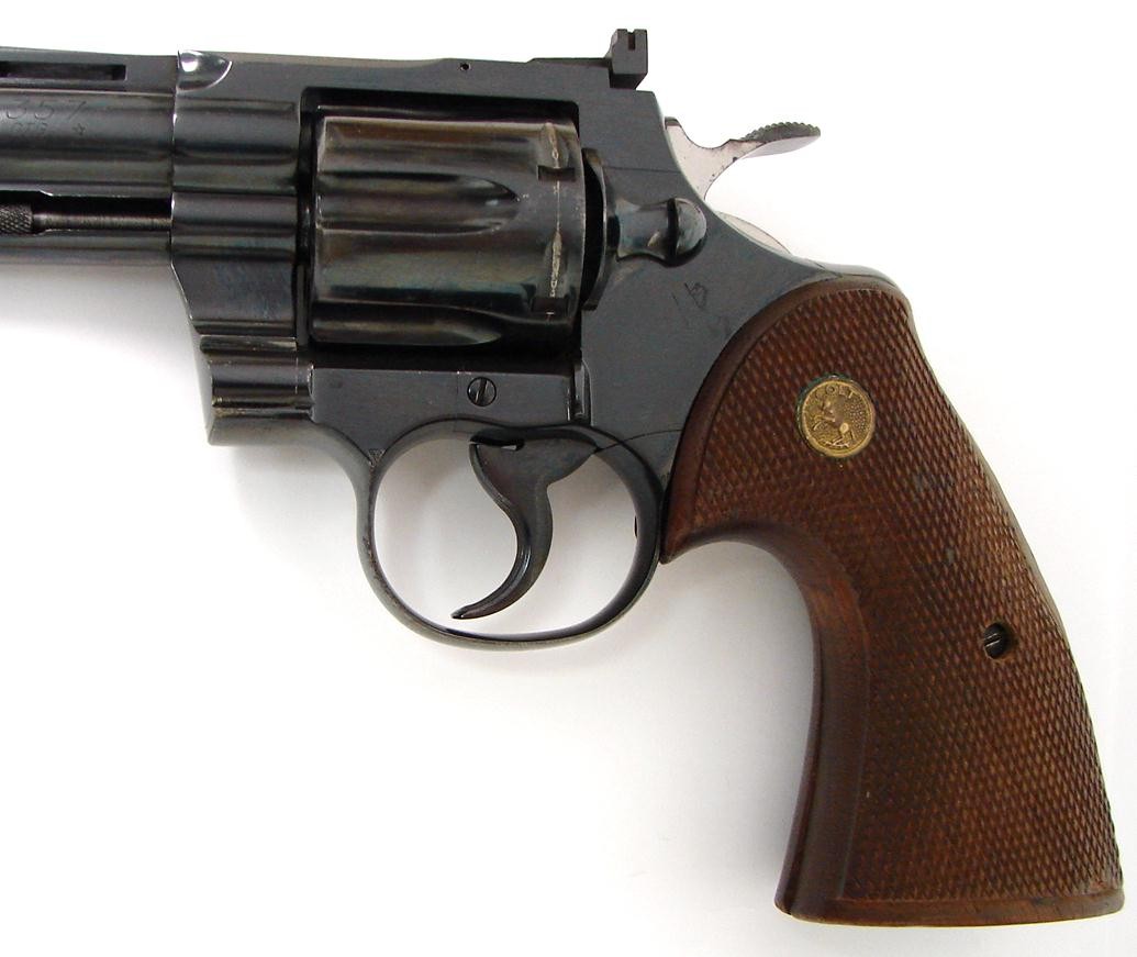 Colt Python .357 Magnum caliber revolver. Very early 6" blue model made in 1958. Shows wear but the bore is excellent and locks up tight. Has correct early style fully checkered grips. A desirable Colt Python.