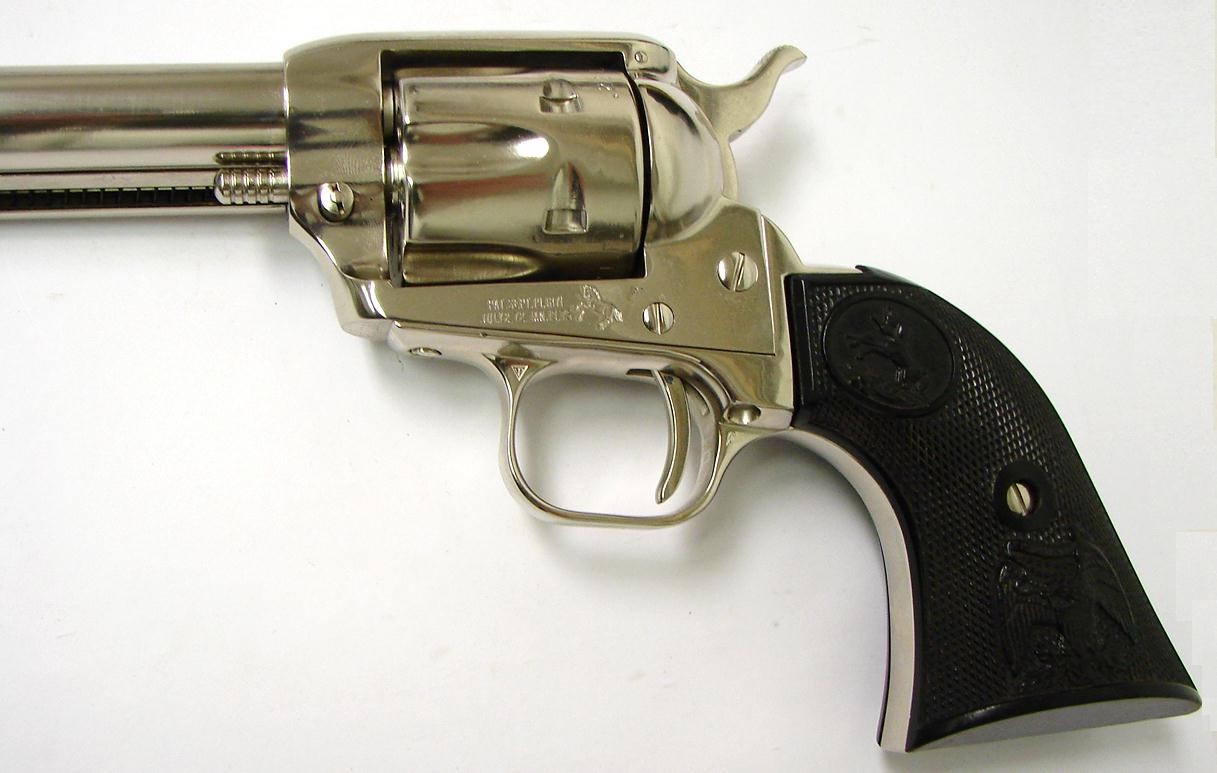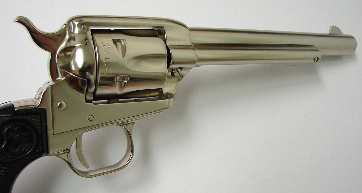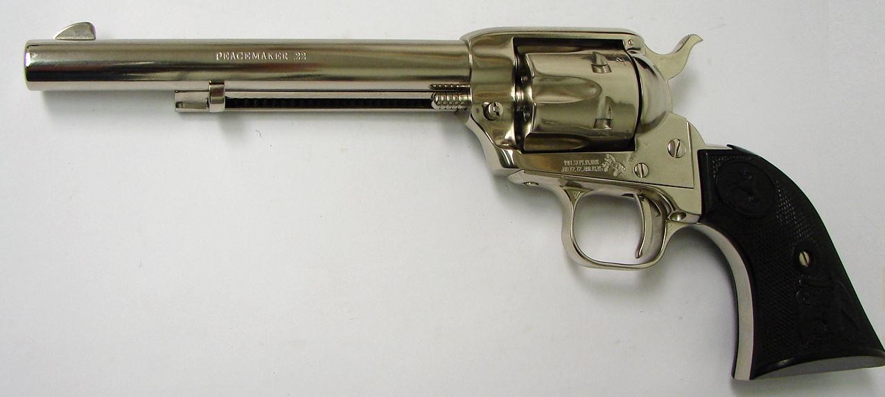 Colt Peacemaker .22 LR caliber revolver. All steel single action with 6" barrel and custom bright nickel finish. Excellent condition.
