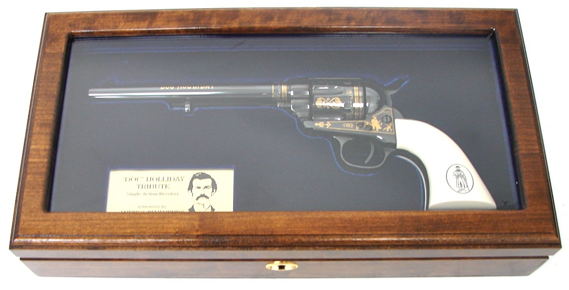 America remembers Doc Holliday Tribute .45 LC caliber commemorative revolver. Uberti Single Action Army revolver with high polish blue and gold decorations. With wood presentation case and paperwork.
