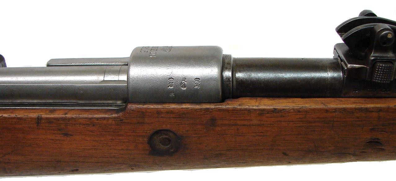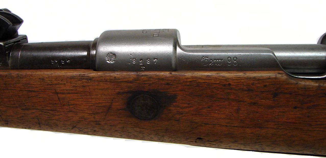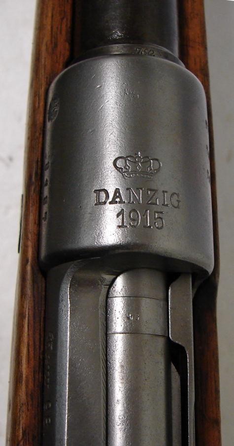Danzig Arsenal 98 8MM caliber rifle. 1915 production for the German military. The only part not matching number is the hand guard. The bolt body is matching and has been renumbered to match The wood is good with two shrapnel hits, one at the butt plate and one at the lower band. The bore has strong rifling and is dark in the grooves. Mostly gray to brown patina finish. No post World War I markings. Good overall condition.