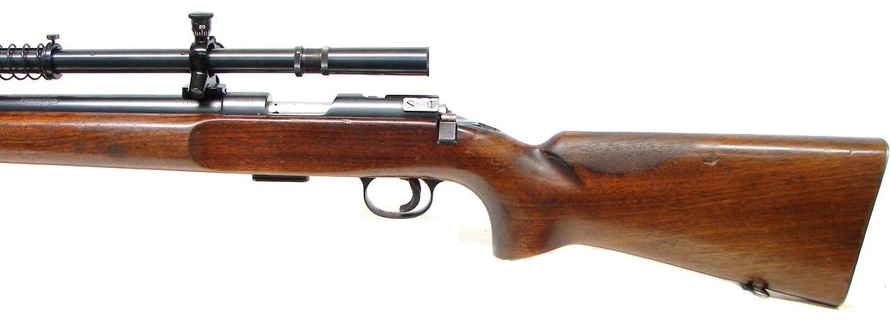 Remington 37 Rangemaster .22 LR caliber rifle. Heavy barrel target rifle with 28" barrel and Lyman super target spot and 1.5x scope. The metal is near excellent with about 95% original finish remaining. The stock shows moderate wear and is very good. The scope is excellent with clear optics. A scarce model, made 1937-40 only.