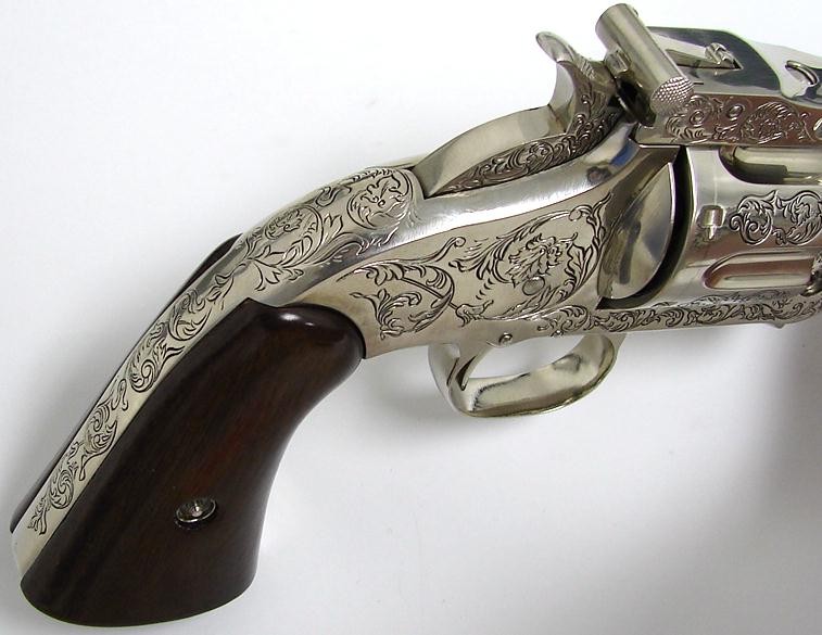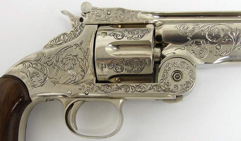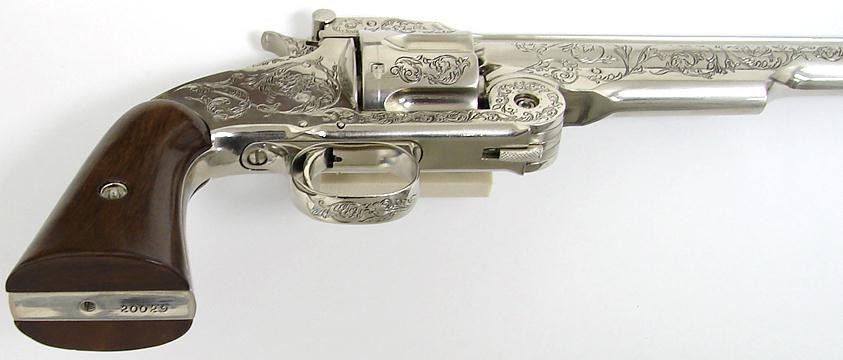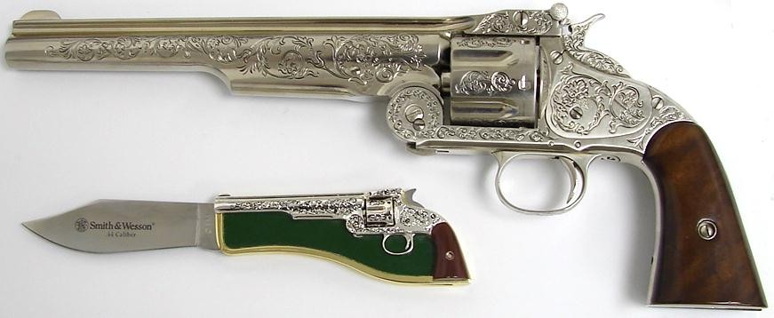 Franklin Mint Wyatt Earp Commemorative .44 Smith & Wesson caliber revolver cased with knife. This is not a real gun. Its a non-firing replica of Wyatt Earps engraved Smith & Wesson.