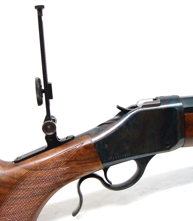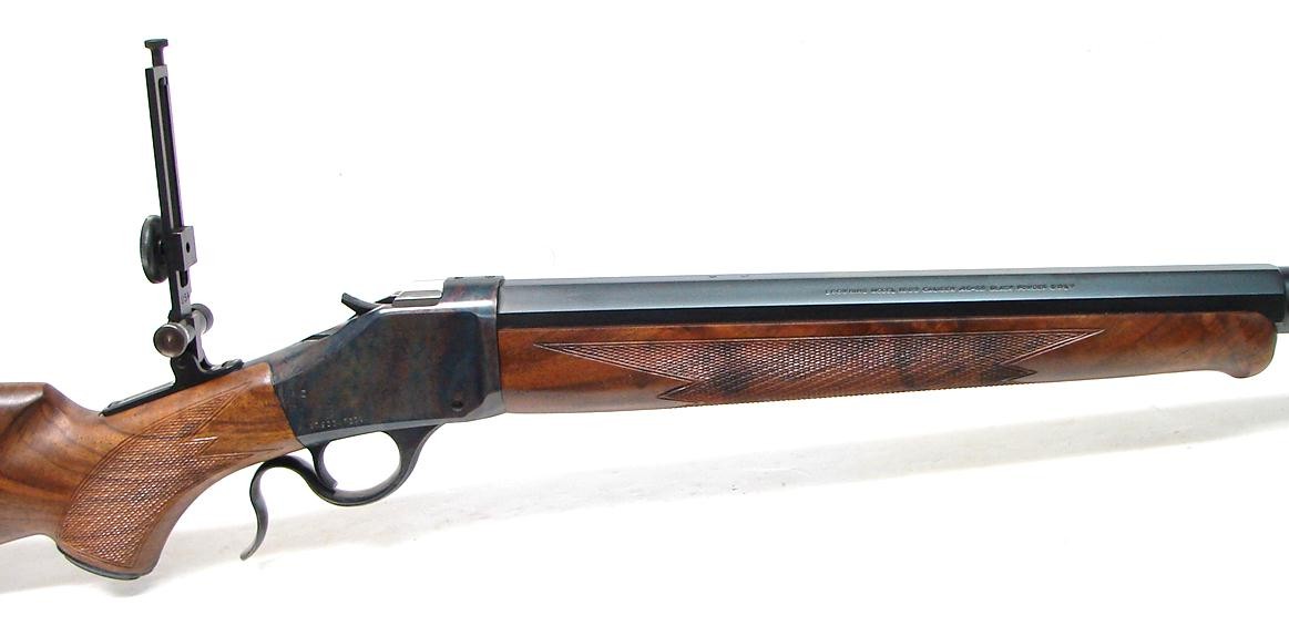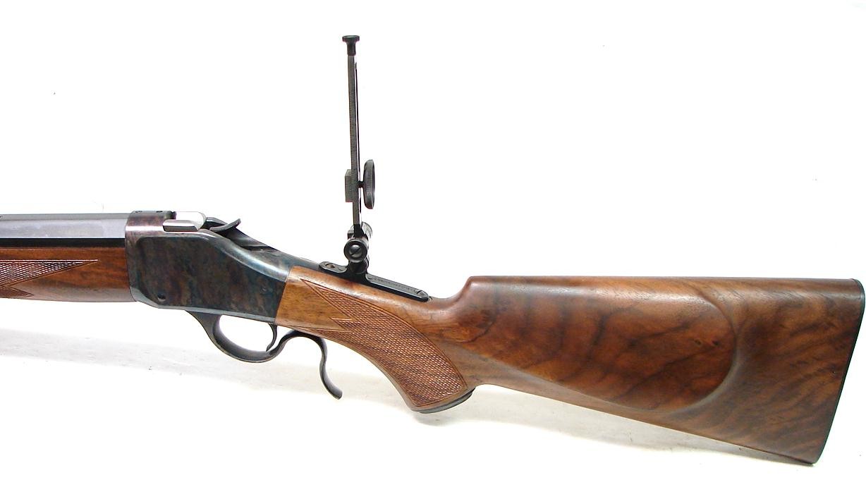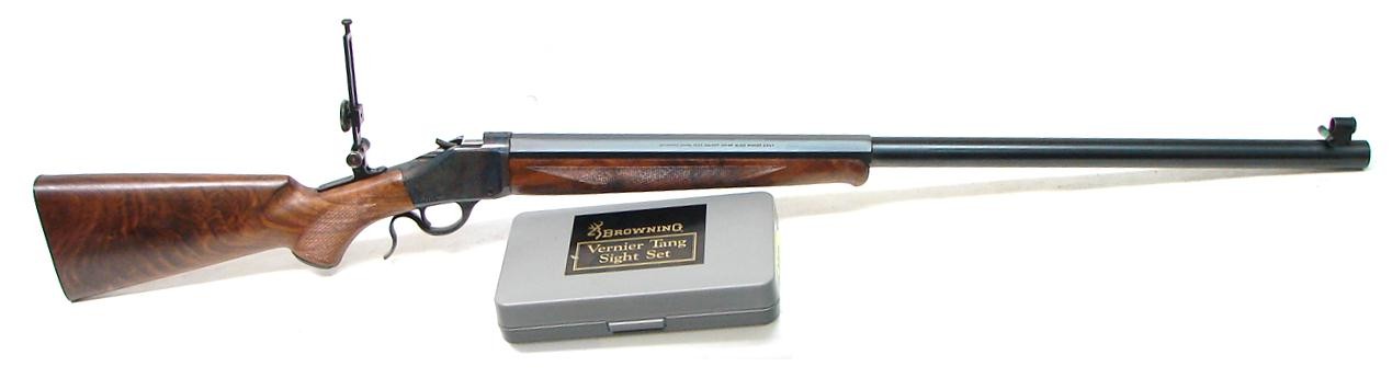 Browning 1885 .40-65 caliber rifle. BPCR model with half round, half octagon barrel, case colored receiver, tang sights, extra fancy walnut. Excellent condition.