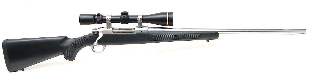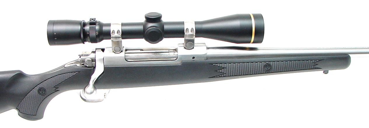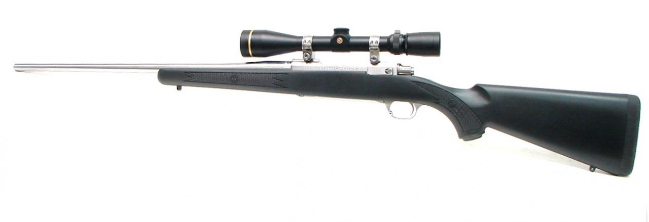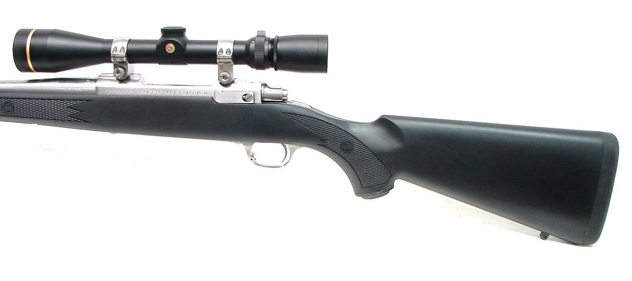 Ruger M77 Mark II .30-06 SPRG caliber rifle. Stainless steel all weather model with synthetic stock and Leupold 3.5 X 10 scope. Excellent condition.