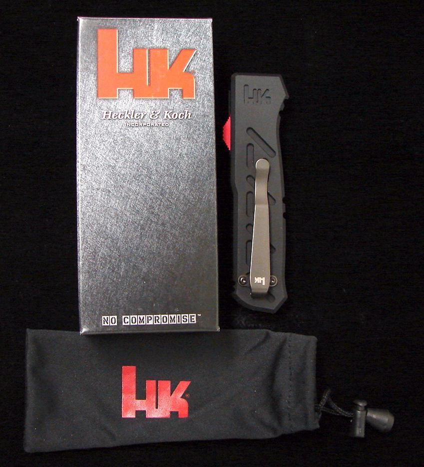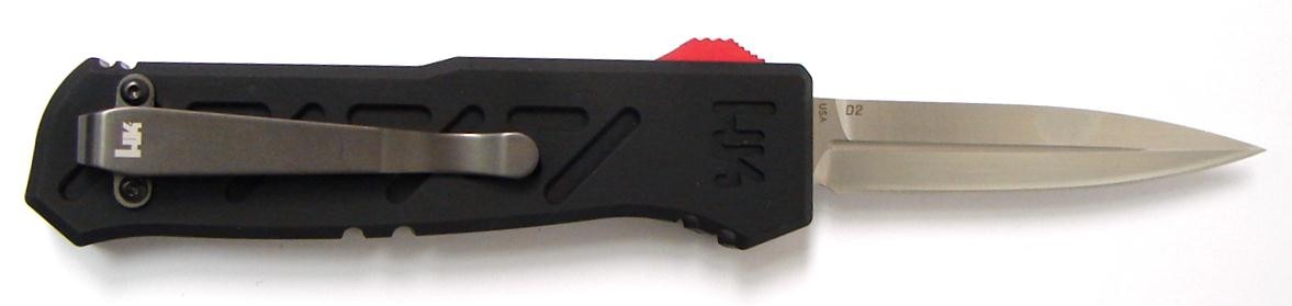 H&K 14850 Epidemic. Automatic - out the front restricted 3 1/2 D2 steel blade. 4 3/4 closed length. In some areas it may be illegal to carry an automatic knife. No returns on any auto knives. New.