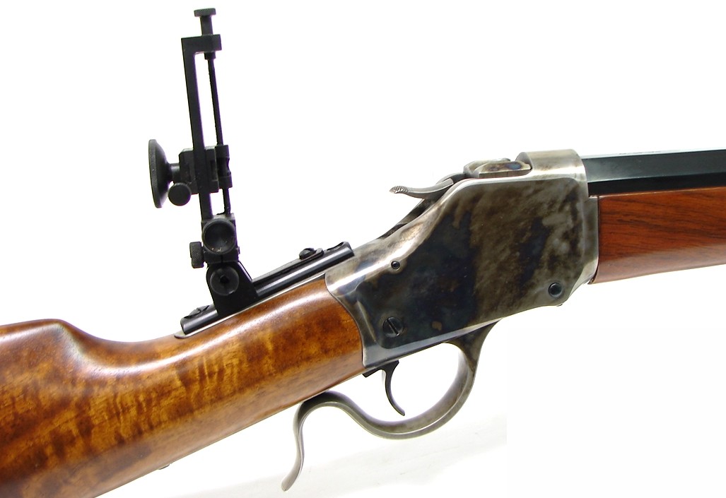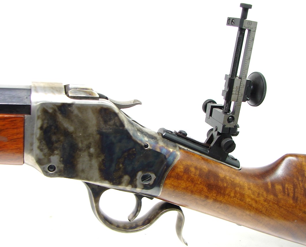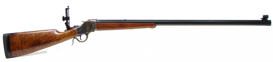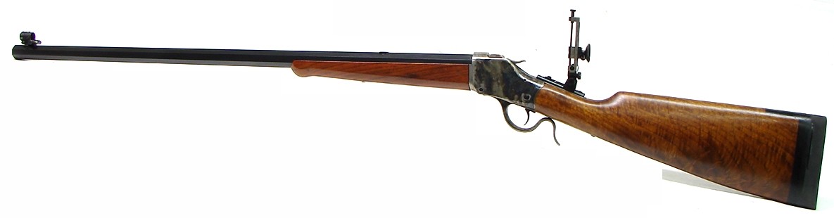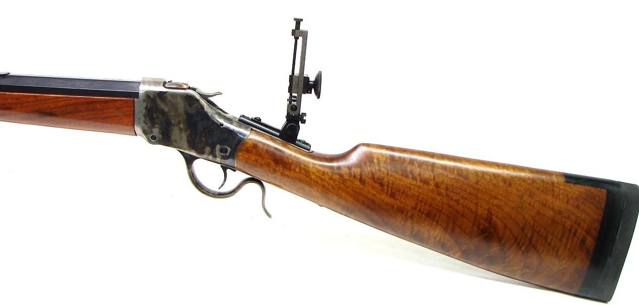 Uberti 1885 .45-70 caliber rifle. High wall single shot rifle with 30" barrel and tang sight. The butt has been extended with a recoil pad. Length of pull is 15 1/4".