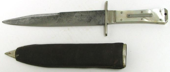 Bowie Knife by R. Bunting & Sons, Sheffield. 7 5/8 clip point blade. Overall length is 11 3/4. Beautiful original pearl scales in semi-coffin shape pommel. Really classically formed blade with scabbard. Fine looking Bowie.