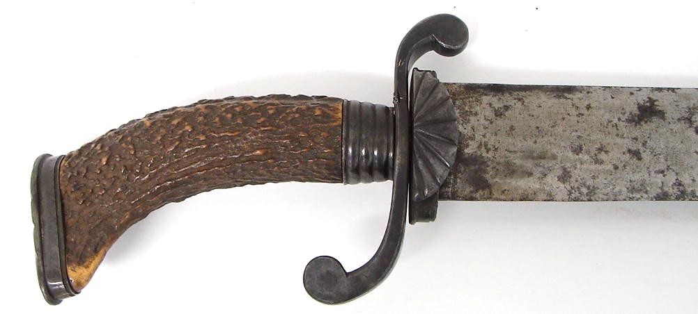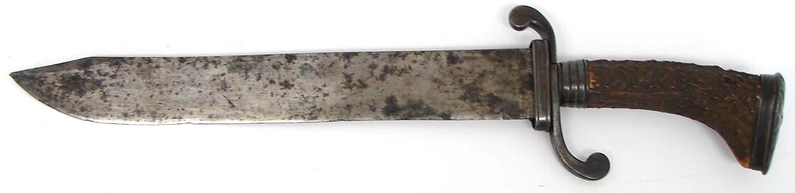 German Hunting knife with stag handle and 10 3/4 bowie style blade. 15 3/4 overall. Circa 1870s. The guard is cracked and the blade shows some staining from surface rust. A good looking old knife.
