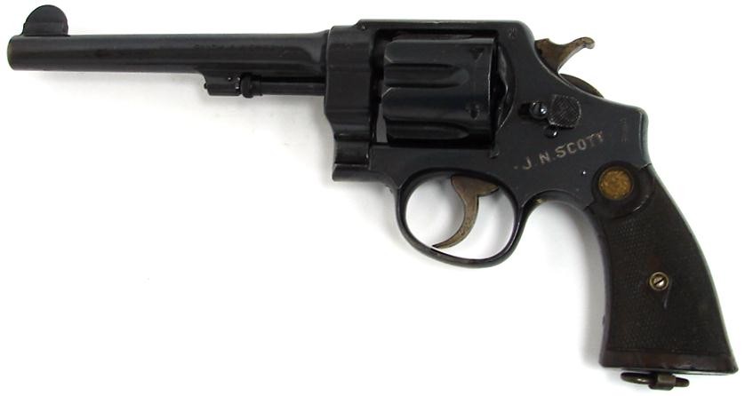 Smith & Wesson Mark II Hand Ejector .455 Mark II caliber revolver with excellent bore and 93-95% blue. Inscribed "J.N. Scott" on left side frame. This is a very nice .455 caliber S&W with inscription that deserves more research.