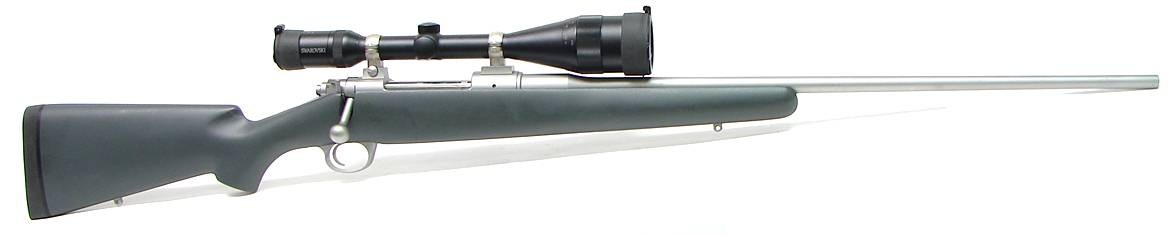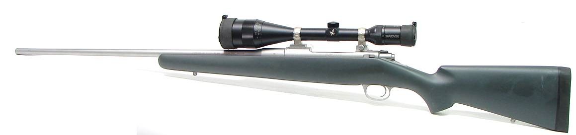 Kimber 8400 Montana .300 Win. Mag. caliber rifle. Stainless bolt action with synthetic stock and Swarovski 6X18 scope. Excellent condition.