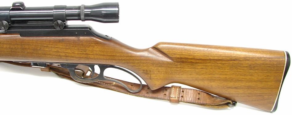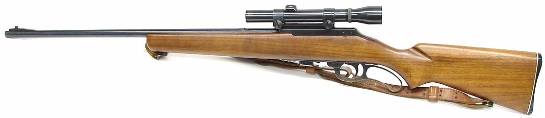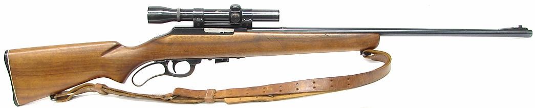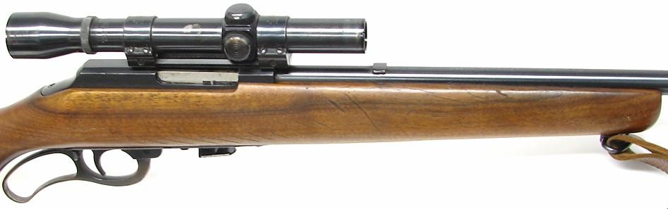 Marlin 56 .22 LR caliber rifle. Scarce 1950s vintage levermatic with clip instead of tube. Stock shows scratches on right side, otherwise the gun is in very good condition with Weaver scope and leather sling.