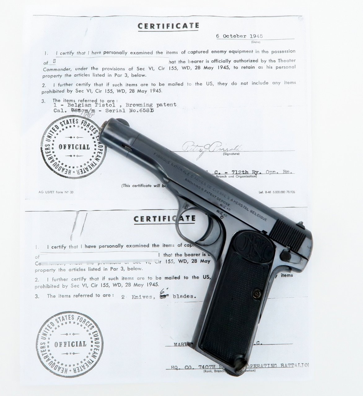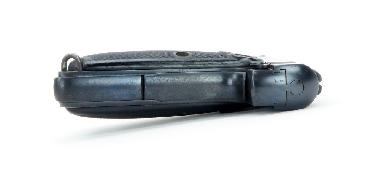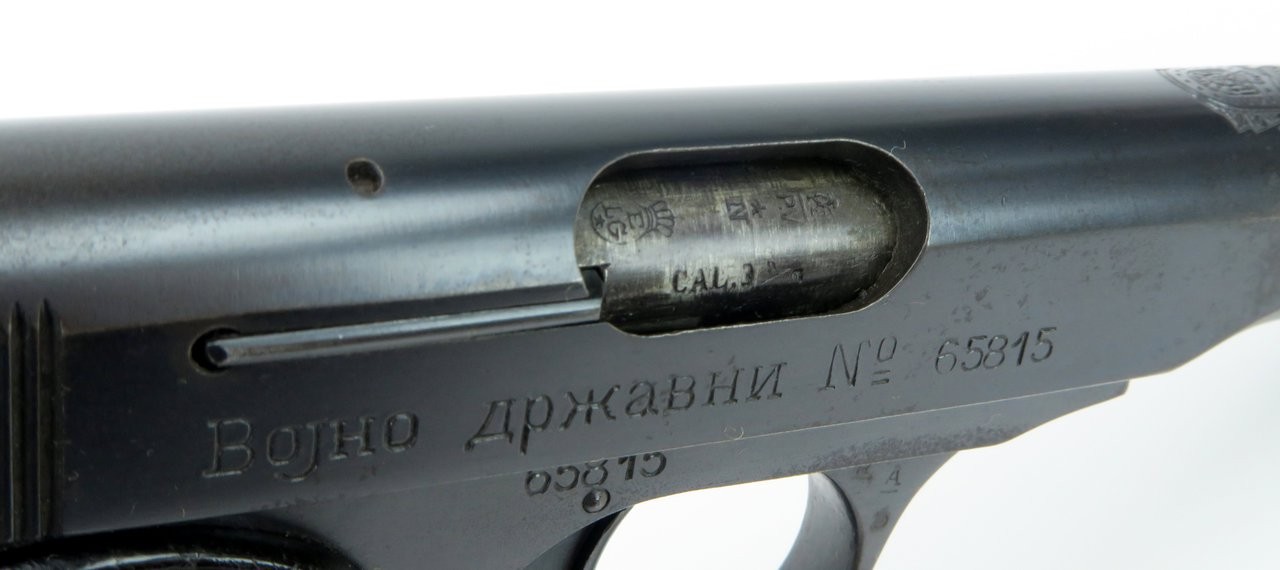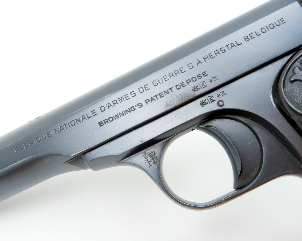 FN 1922 .380 ACP caliber pistol. Yugoslavian contract. Excellent bore with matching numbers. Grips are excellent. Gun has 97-98% original blue. Gun has the Royal Crest of The Kingdom of Yugoslavia. Bore is excellent. This 1922 FN is in superior condition for a Yugoslavian Contract gun. Most are well used. A good one has 70% finish. This one has 98%.