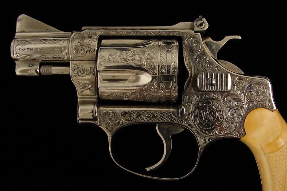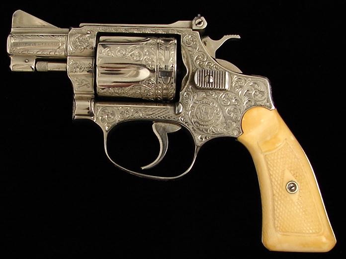 Smith & Wesson Chiefs Special .38 Special caliber revolver. Rare early 4-screw 2 target model with beautiful custom engraving, nickel finish and ivory grips. A very desirable S&W revolver, lavishly embellished.