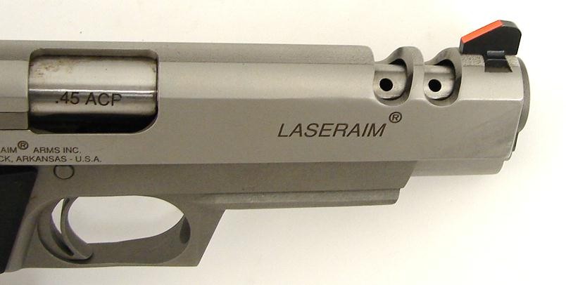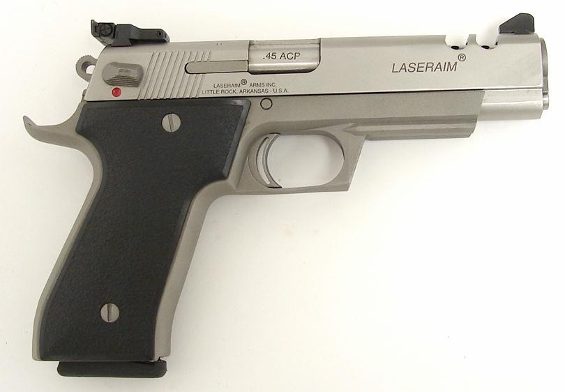 Laseraim Arms Co Series III .45 ACP caliber pistol. Scarce 1990s vintage stainless auto with ported barrel and laser/light rail. Excellent condition with original box.