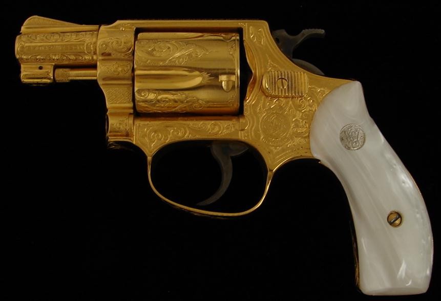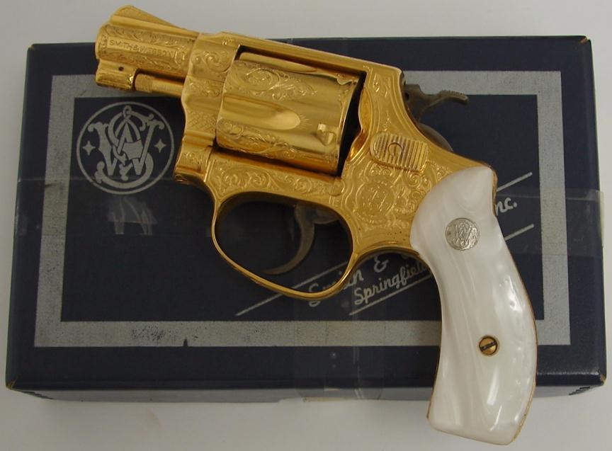 Smith & Wesson 36 .38 Special caliber revolver. Beautiful custom engraved and gold plated Chiefs Special. Early model with flat latch. Excellent condition with fancy pearlite grips and original box.