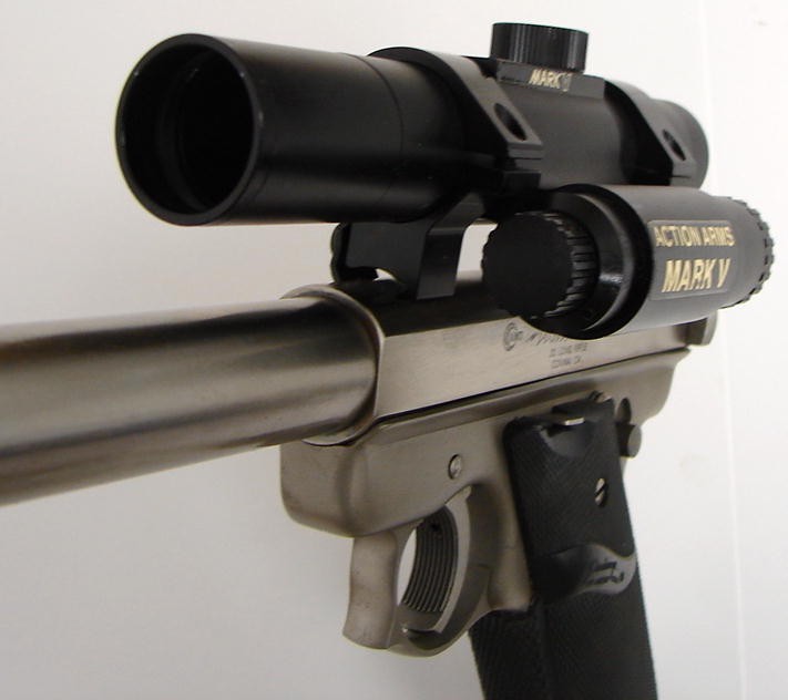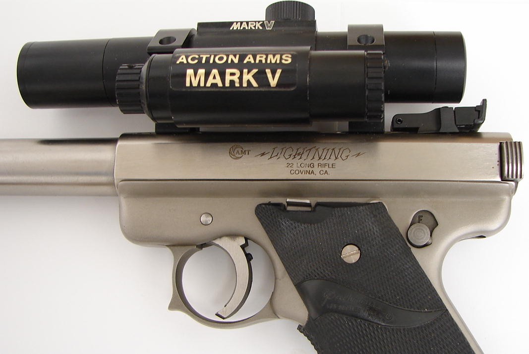 AMT Lightning .22 caliber handgun. Stainless target model with 10.5 bull barrel and red dot sight. Very good condition. (pr12500)