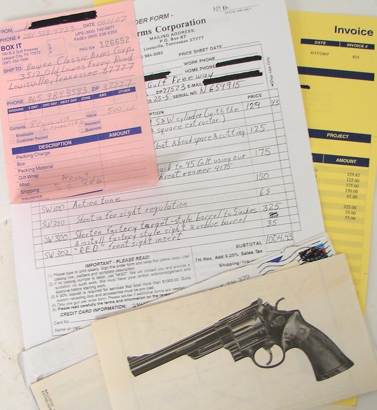 Smith & Wesson 25-5 .45 LC caliber revolver. Outstanding Hamilton Bowen customized pinned barrel 25-5. The barrel has been cut to 5". The action has been tuned and a new .44 Magnum cylinder has been re-chambered to .45 and fitted to the gun. This was done for greater strength for hot loads. The guns is in excellent condition. Comes with paperwork noting the work done. A mans gun for sure!
