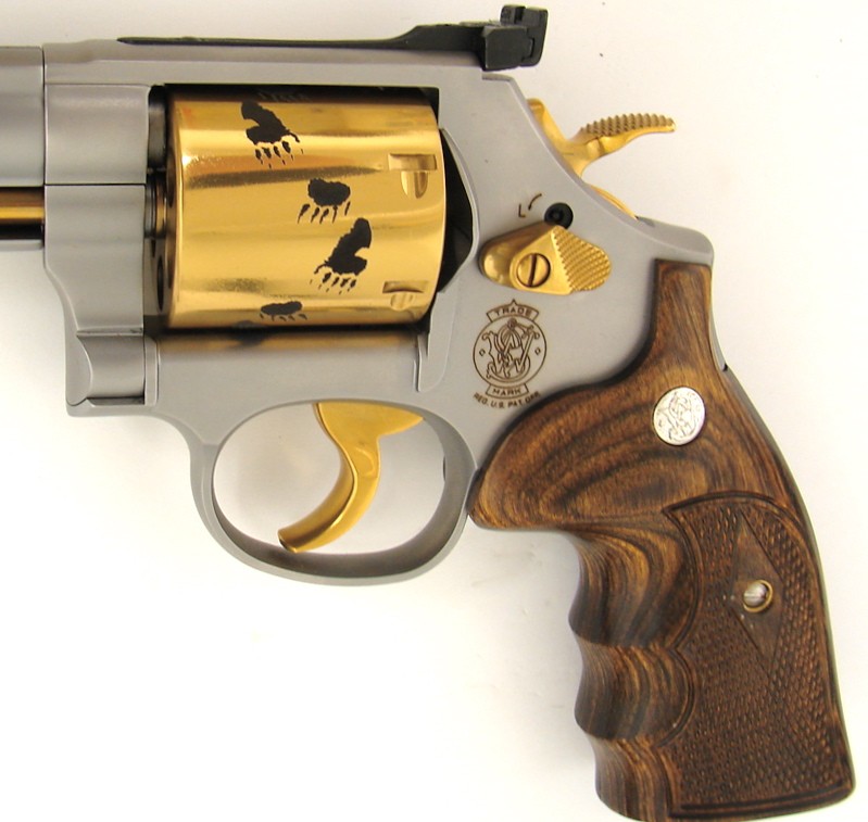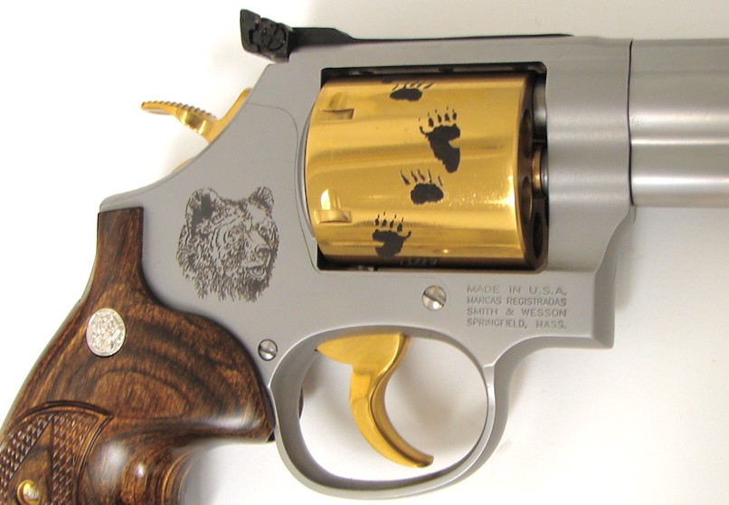 Smith & Wesson 686-6 .357 Mag caliber revolver. Limited edition grizzly model with gold plated parts and etched bear head and paw prints. New.