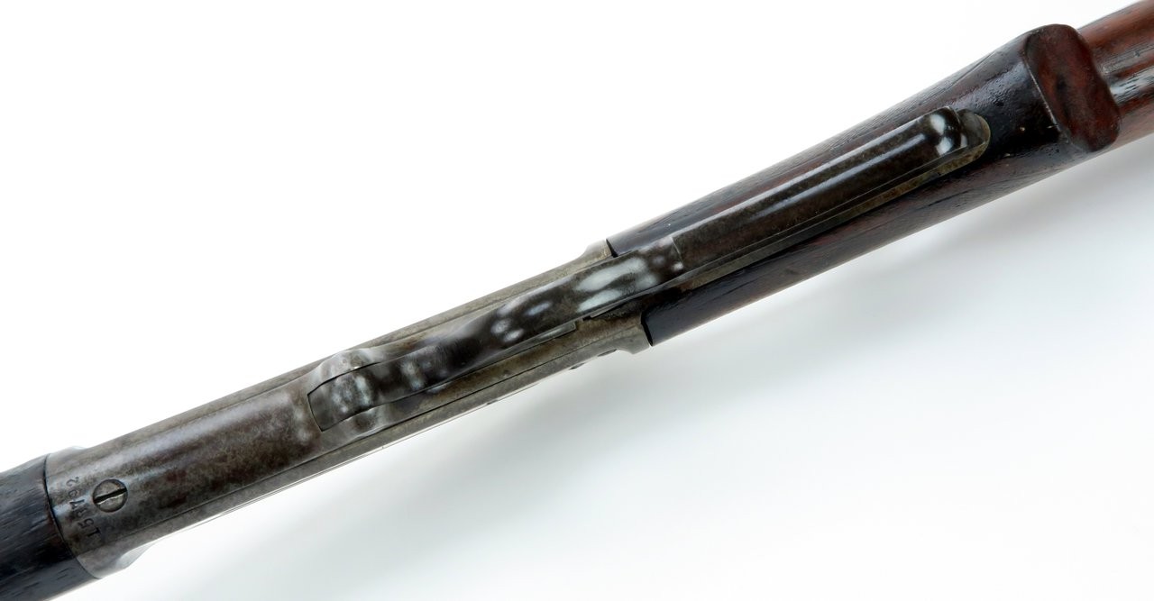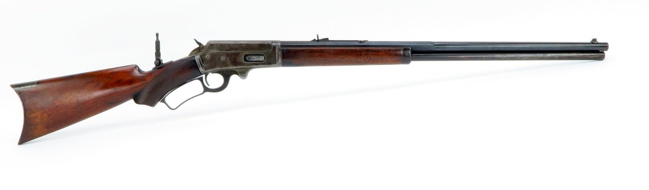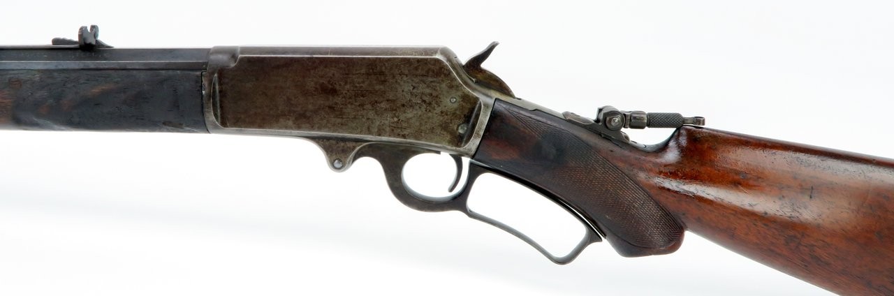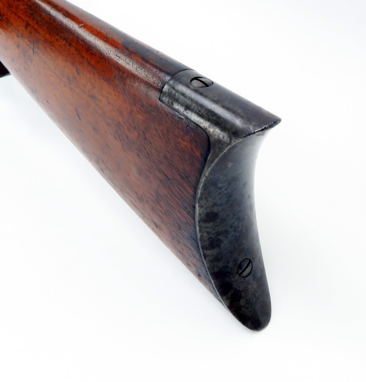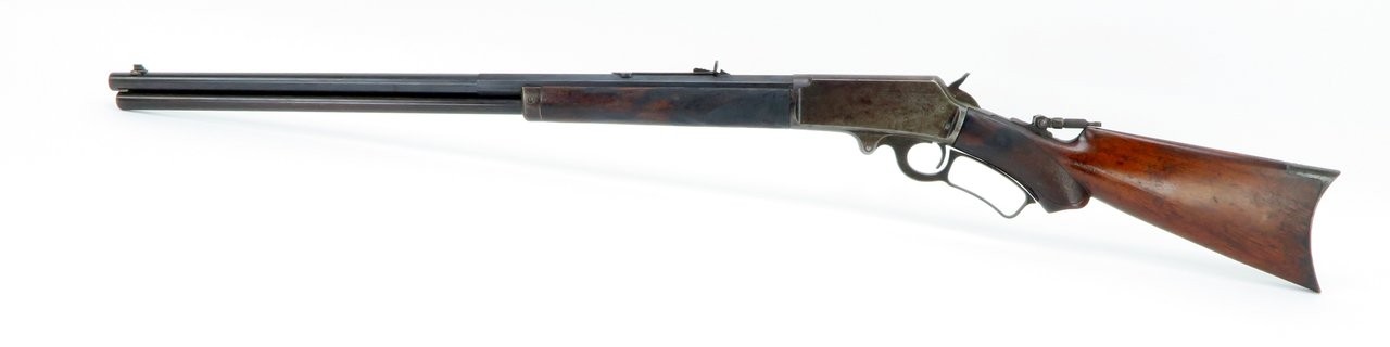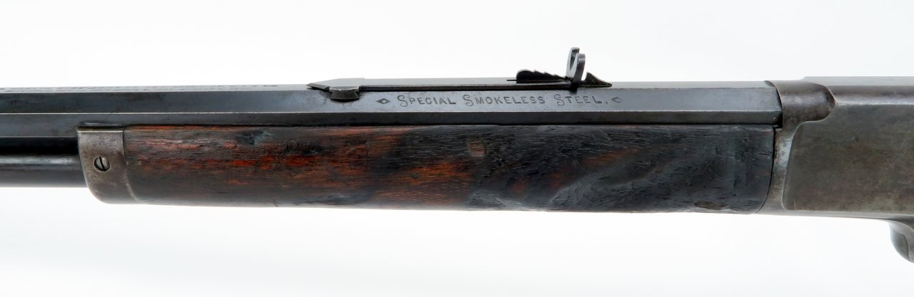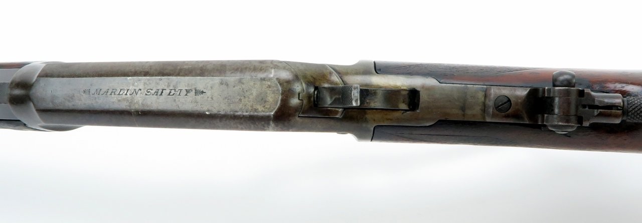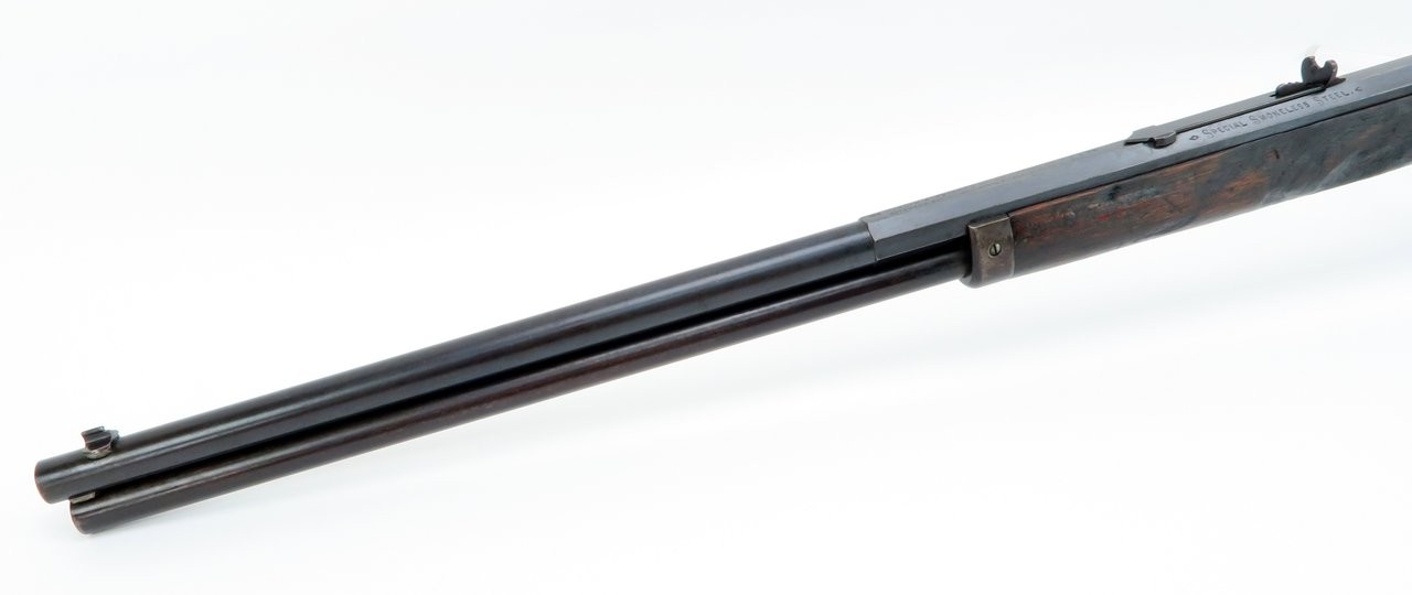 Marlin model 1893 Manufactured in 1897. Caliber is .38-55 deluxe with pistol grip and checkering. Barrel is half round and half octagonal. Bore is very good. Action works perfectly. Barrel has good plus blue. Stock checkering is worn and forend has some damage, we think due to heat. Only about 5” from the frame forward was affected. Reasonably priced deluxe ’93 in .38-55 caliber.