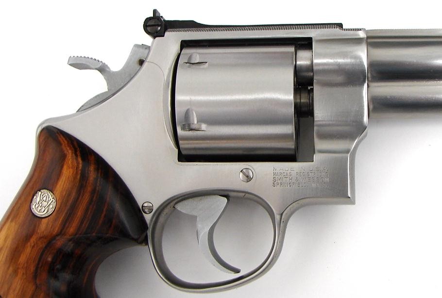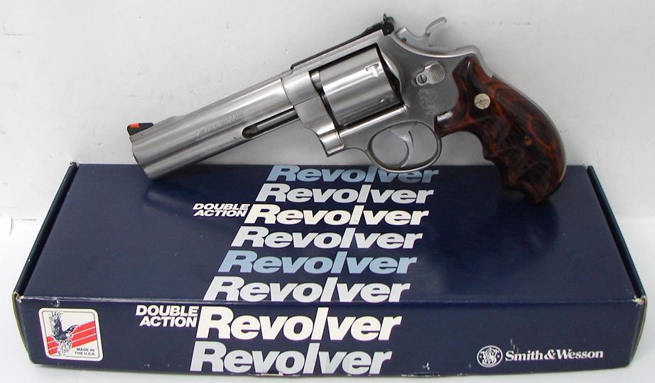 Smith & Wesson 627-0 .357 Mag. caliber revolver. Rare 6-shot stainless gun with 5 1/2" full lug barrel marked "Model of 1989". Has round butt grip frame with wood combat grips. Very hard to find. Excellent condition with box.