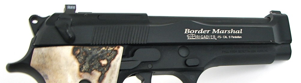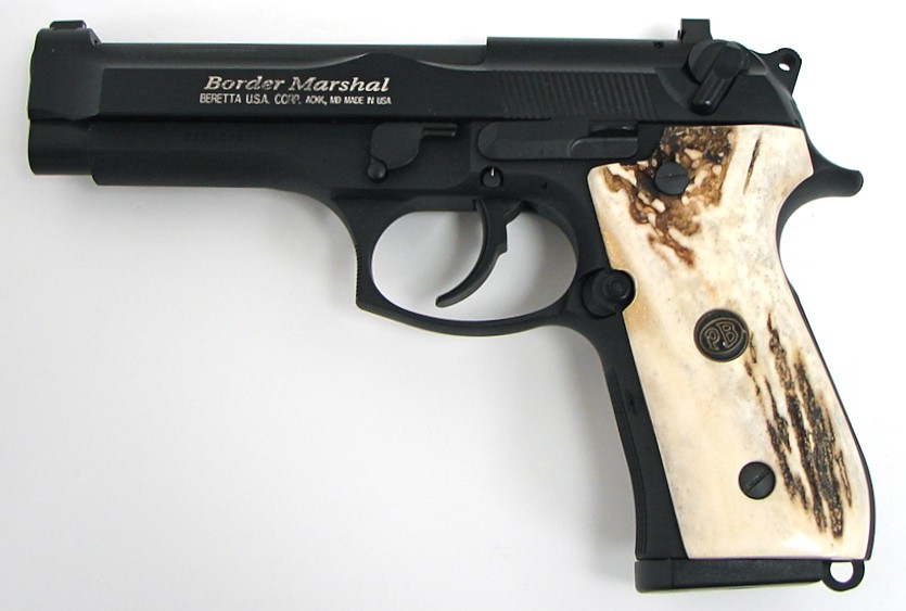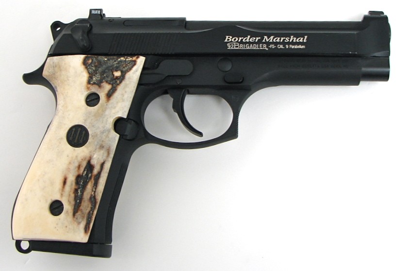 Beretta 92FS Brigadier 9 MM Para caliber pistol. Border Marshal Special Edition with custom stag grips. Excellent condition.