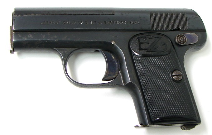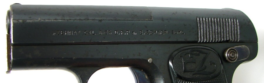 Zehna Pocket Pistol .25 ACP caliber pistol. W.W. I era production in Germany 70% finish with some light rust. Good grips with no chips or cracks. The bore has strong rifling and is dark in the grooves. Good overall condition.