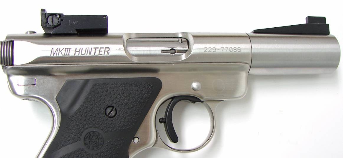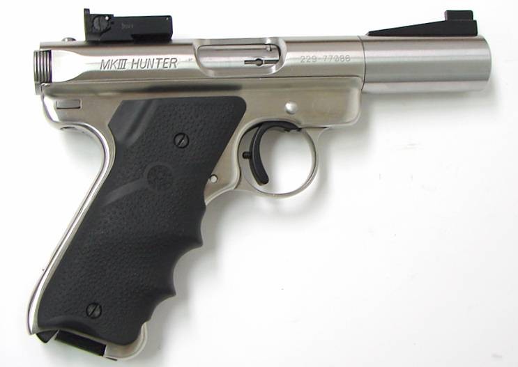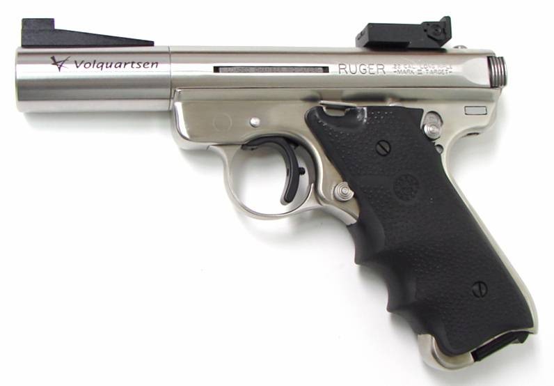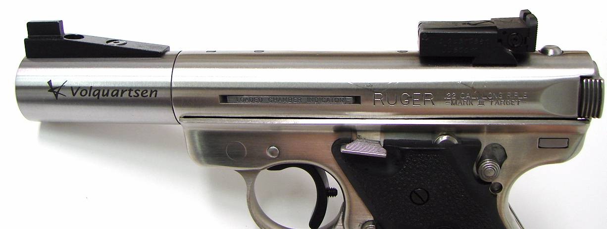 Ruger Mark III Target .22 LR caliber pistol. Volquartsen custom target pistol with 3 3/4 bull barrel. Excellent condition.