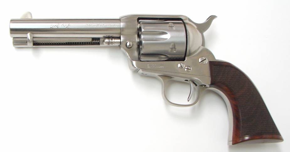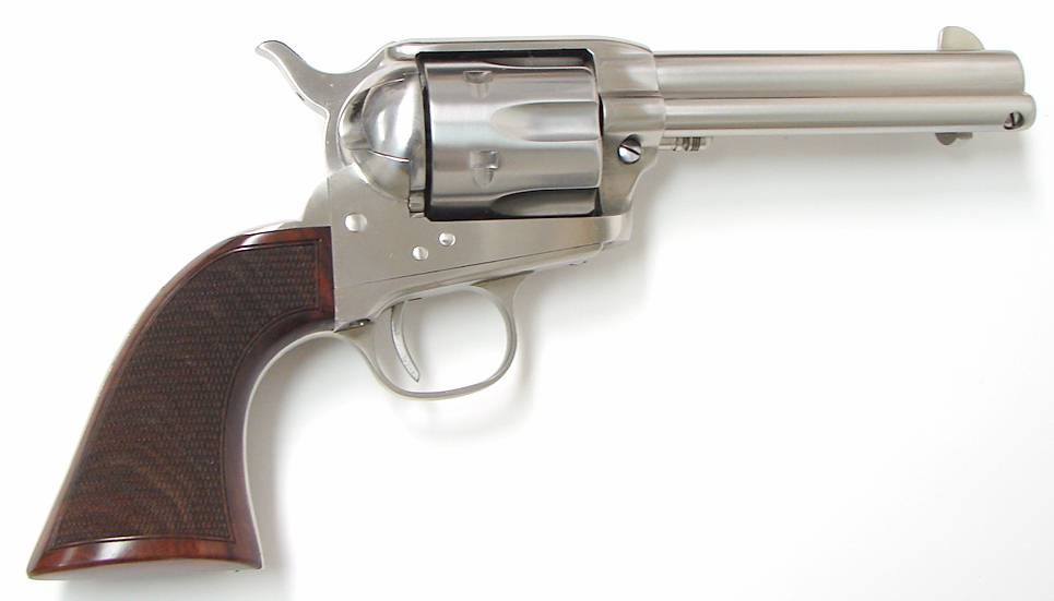 Uberti Evil Roy .357 Magnum caliber revolver. "Evil Roy" stainless steel in satin finish with 4 3/4" barrel, one piece checkered grips. Like all "Evil Roys", this one has a well tuned finish. New.