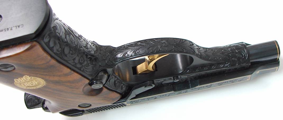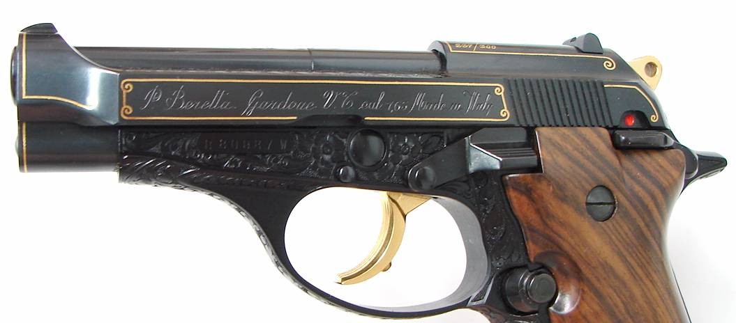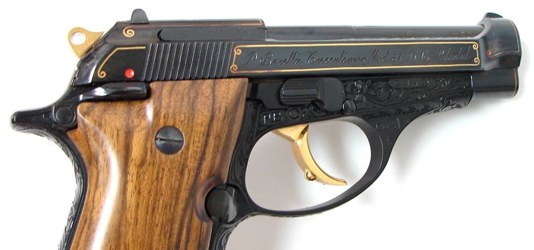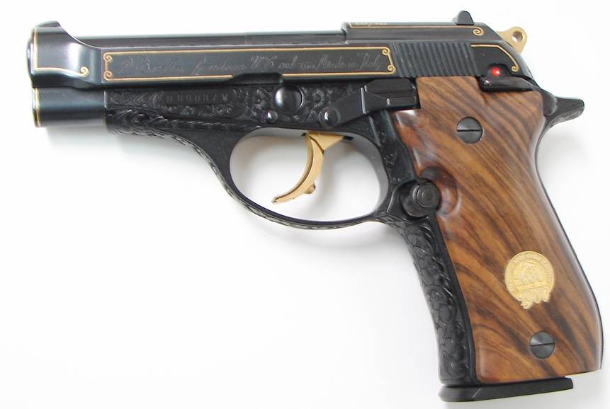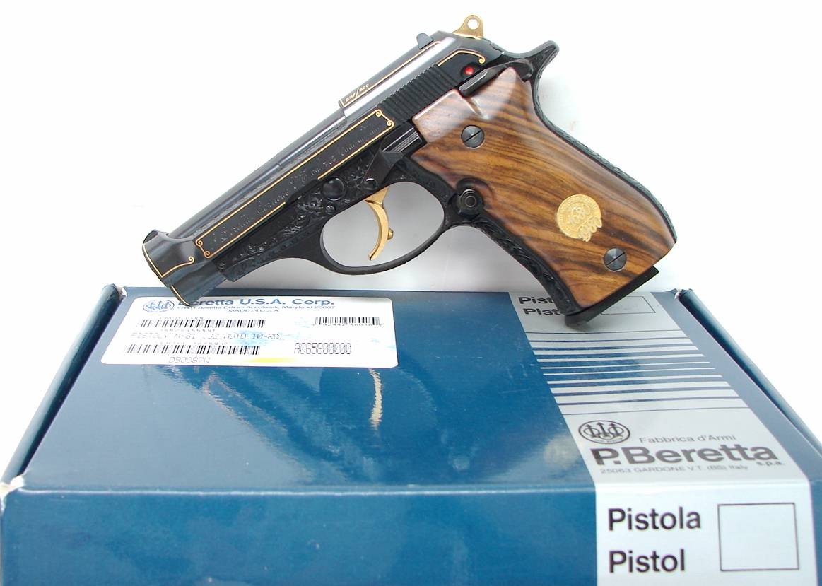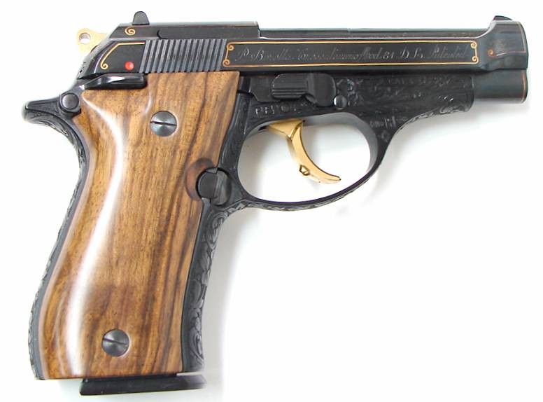 Beretta 81 DL .32 ACP caliber pistol. Beautiful factory engraved deluxe model. Has fancy scroll, gold line inlay and fancy wood grips. Excellent condition with original box.