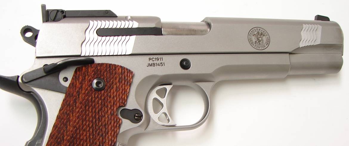 Smith & Wesson PC 1911 .45 ACP caliber pistol. Smith & Wesson performance. Center 1911 in .45 ACP with adjustable sights, safety, wave slide serrations, beavertail, checkered mainspring housing, wood grips, and with one magazine. Demo model with full factory warranty.