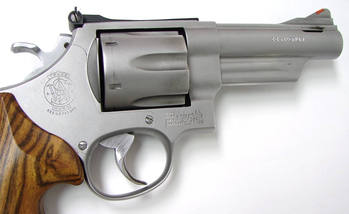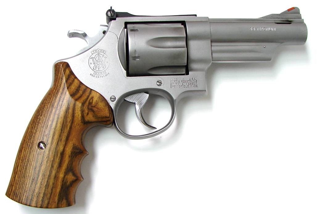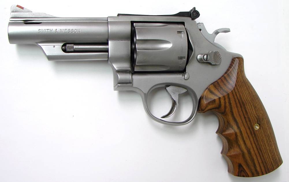 Smith & Wesson 629-1 .44 Mag caliber revolver. 1980s vintage 4" stainless model customized for combat. Has custom ported barrel with Mag-Na-Port slots at the muzzle and circular ports on the top of the rib. Also has a custom matte finish and wood combat grips with a super slick action job. An outstanding big bore wheel gun.
