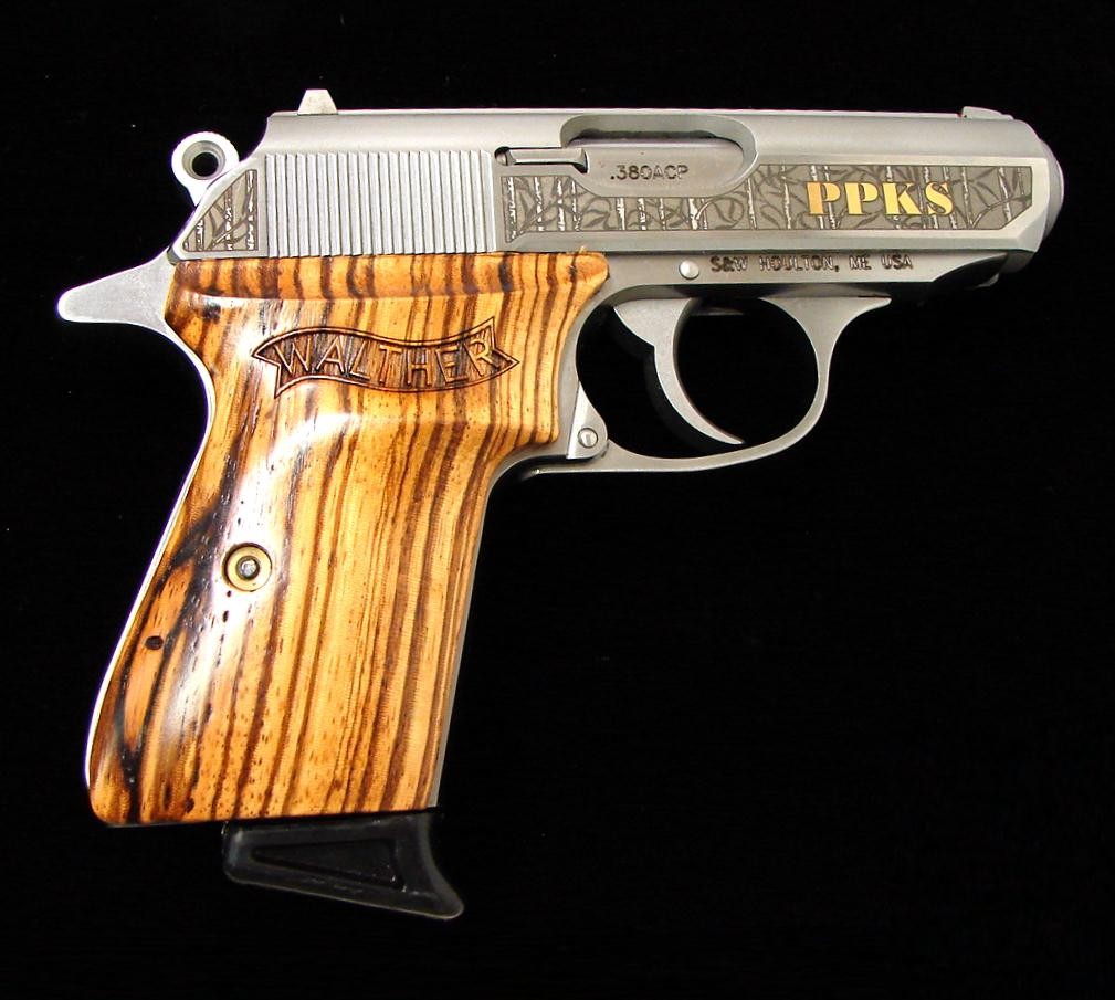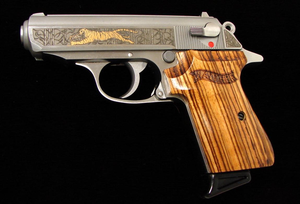 Walther PPK/S-1 .380 ACP caliber pistol. Golden Tiger Special Edition with etched slide and fancy wood grips. Excellent condition.