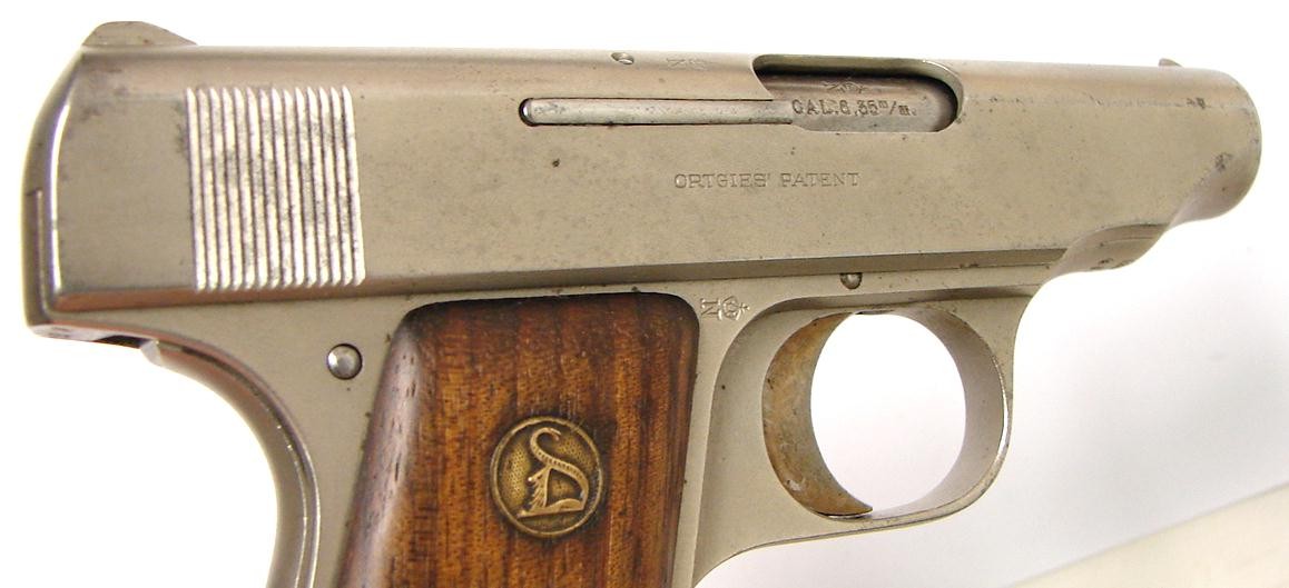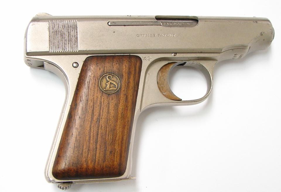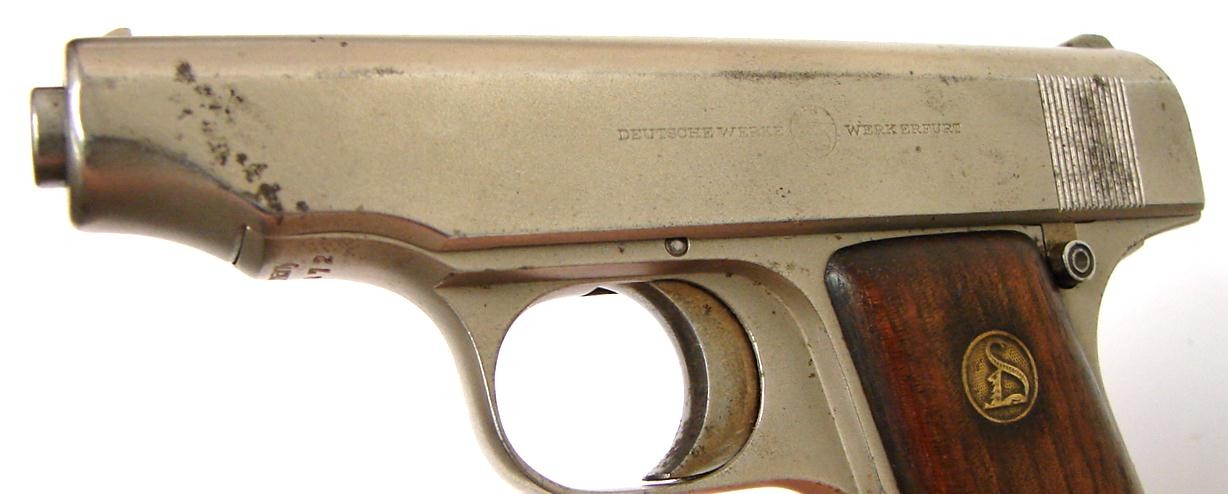Deutsche Werke Vest Pocket 6.35mm caliber pistol. Produced in the 1920's for sales in the U.S. Has the very seldom seen original nickel finish, about 90% remaining. The bore has strong rifling and is dark in the grooves. Excellent grips. About very good over all condition.