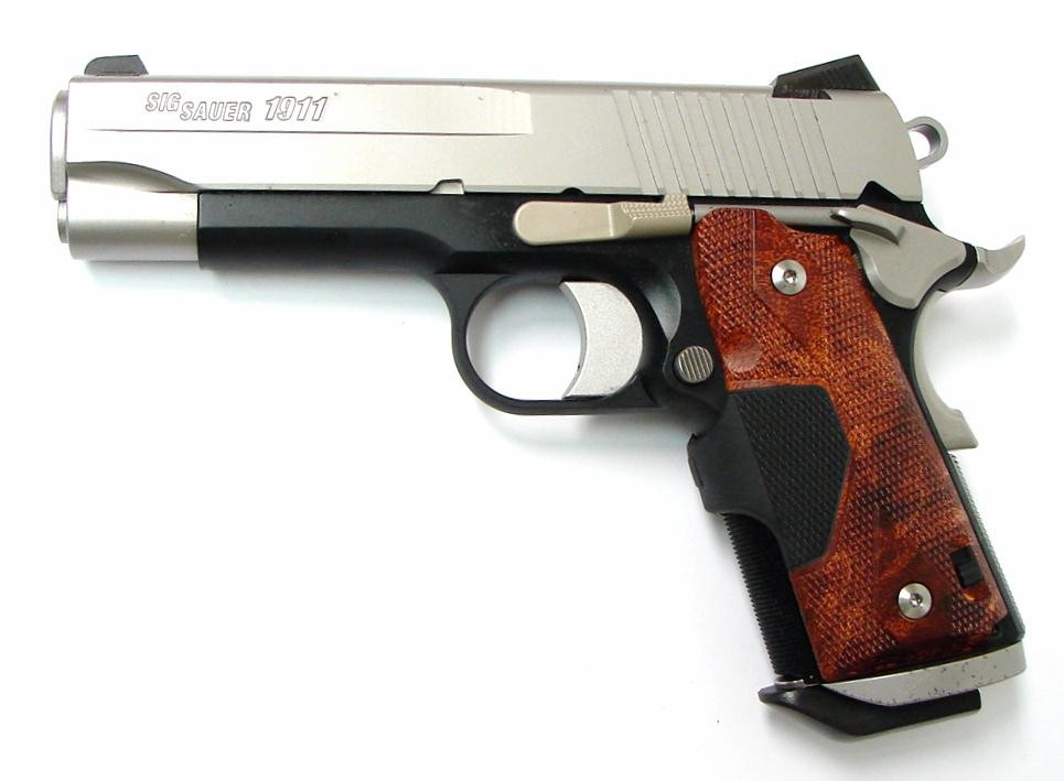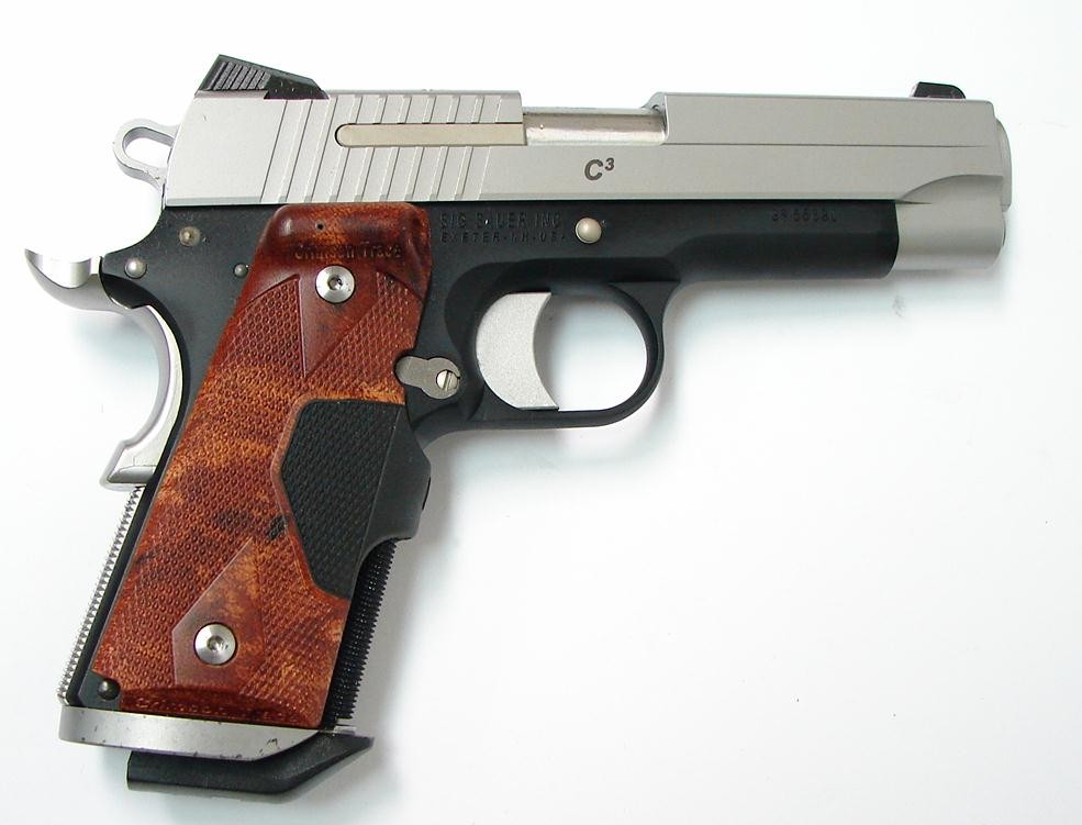 Sig Sauer 1911 C3 .45 ACP caliber pistol. 4" carry model with night sights and Crimson Trace laser grip. Excellent condition.