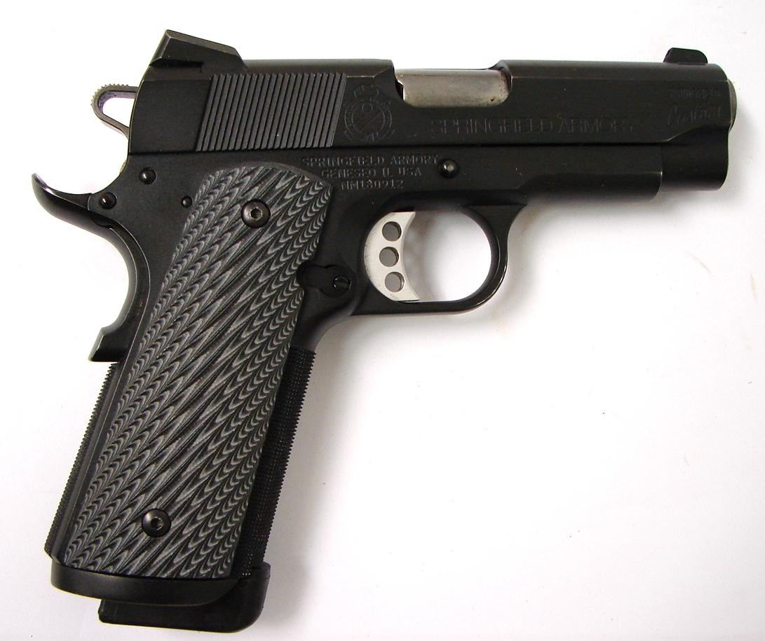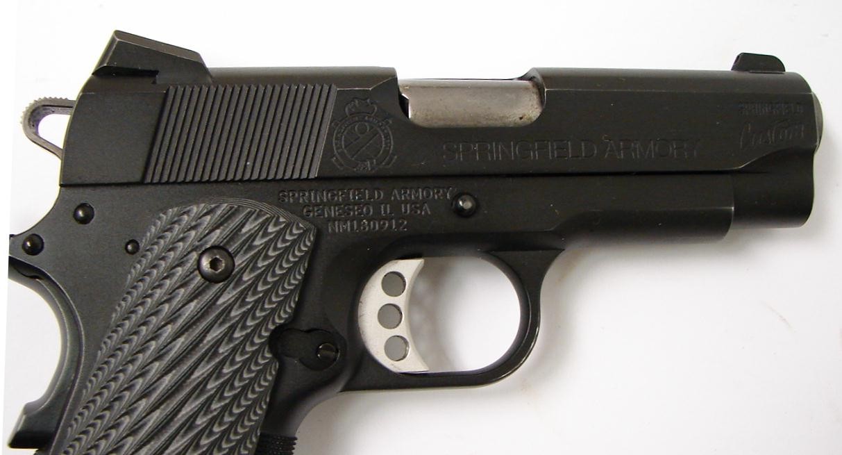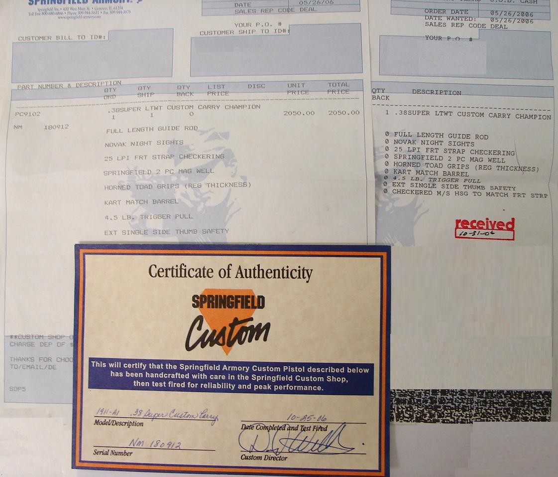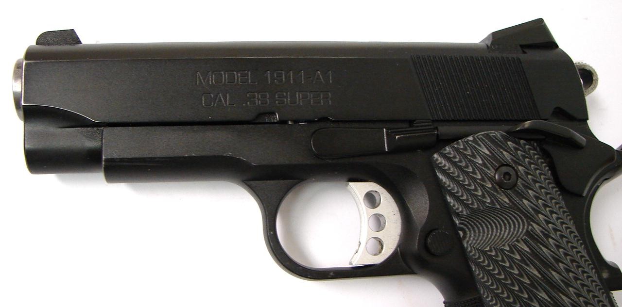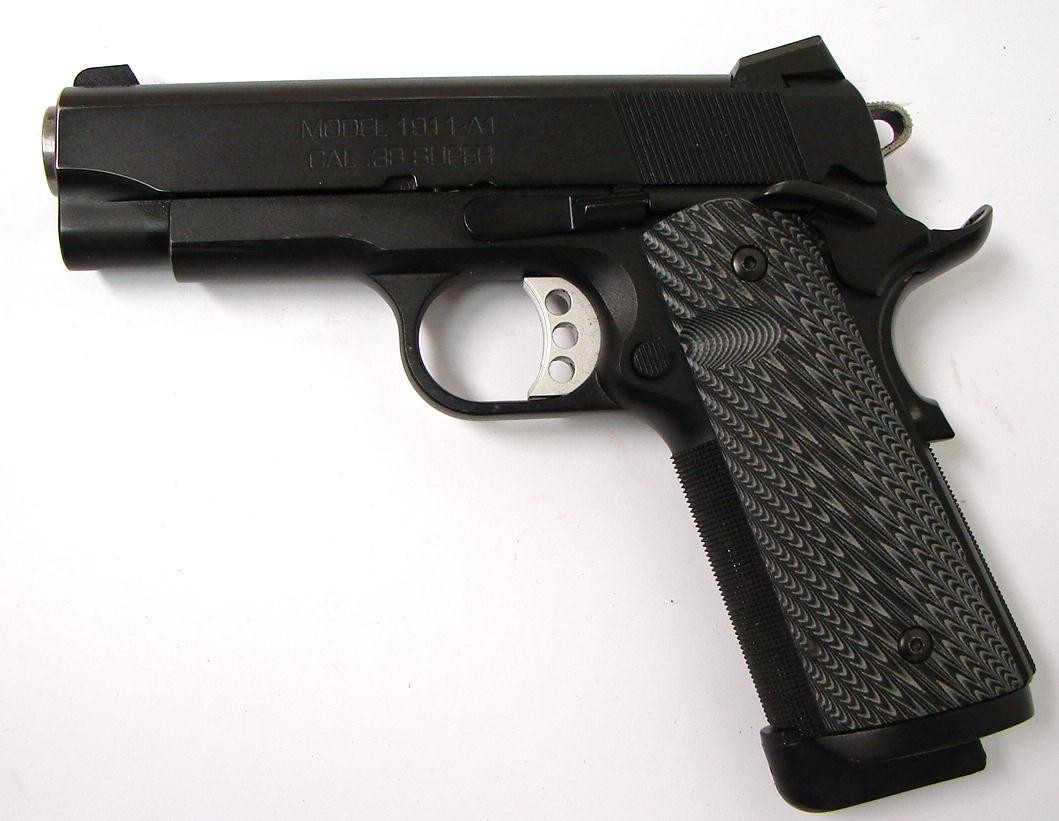 Springfield 1911-A1 .38 Super caliber pistol. Rare custom shop .38 super "LW Custom Carry" model. A premium grade combat pistol in excellent condition with factory papers.
