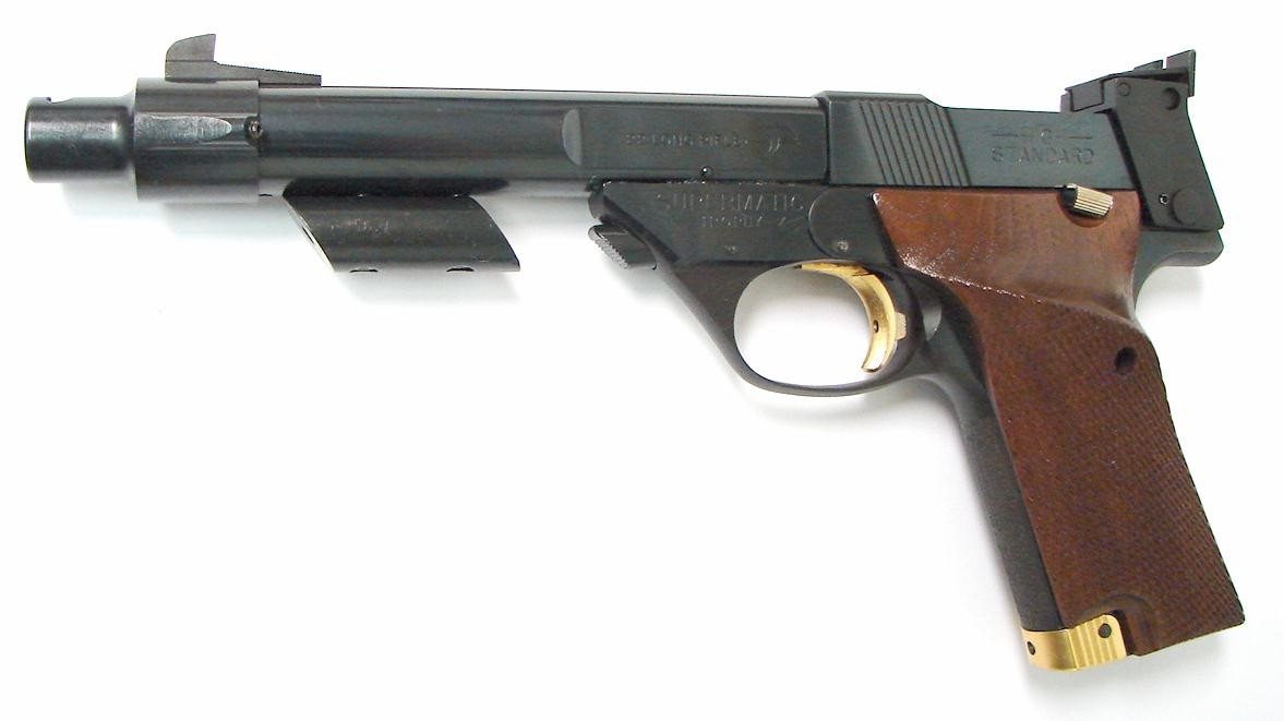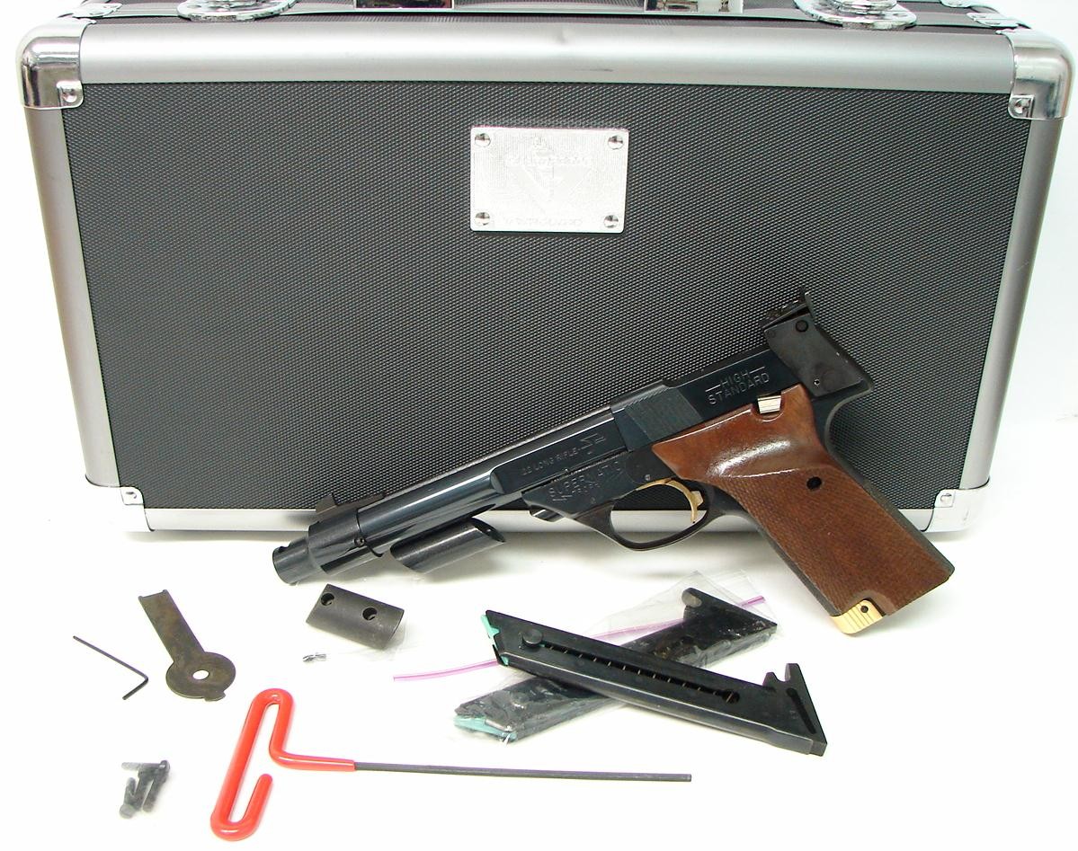 High Standard 107 Military Supermatic Trophy target model with 5 3/4" barrel, compensator and barrel weight. The gun has been expertly refinished and is in excellent condition with 2 extra magazines and another barrel weight, all in a modern carry case. A neat set.
