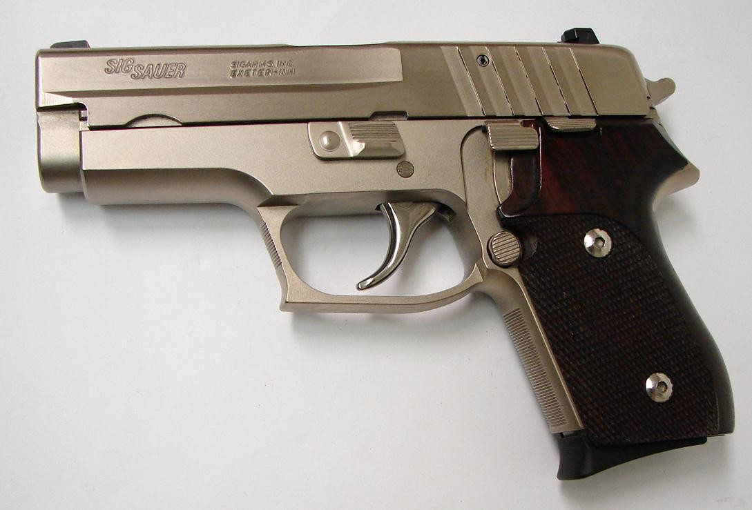 Sig Sauer P245 .45 ACP caliber pistol. Compact model with satin nickel finish and custom wood grips. Excellent condition with jeweled barrel, polished trigger and action job. A great carry gun.