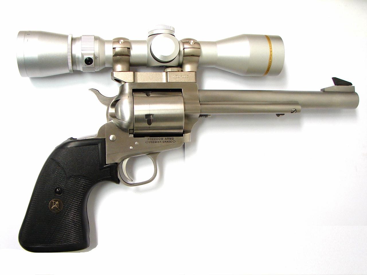 Freedom Arms Premier Grade .454 Casull caliber revolver. 7 1/2" model with Leupold 2.5x8 scope and Pachmayr rubber grips. Also has the original wood grips and the rear sight. Excellent condition with box.