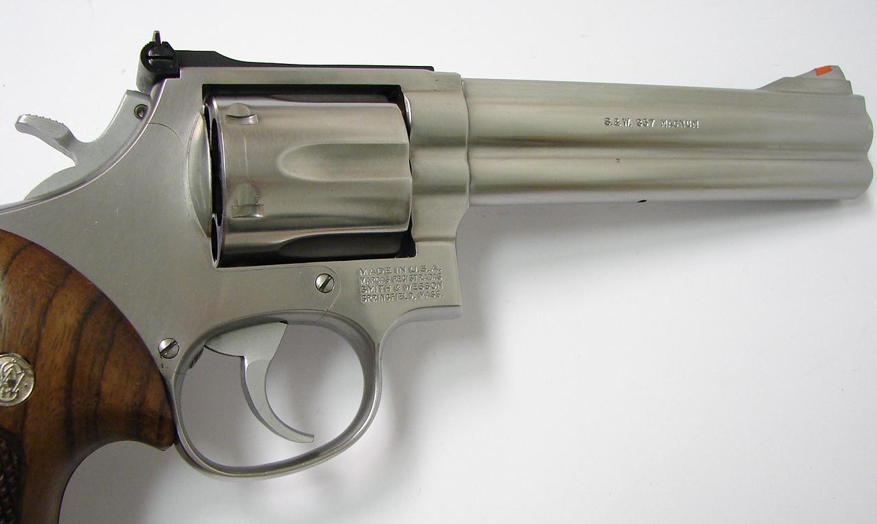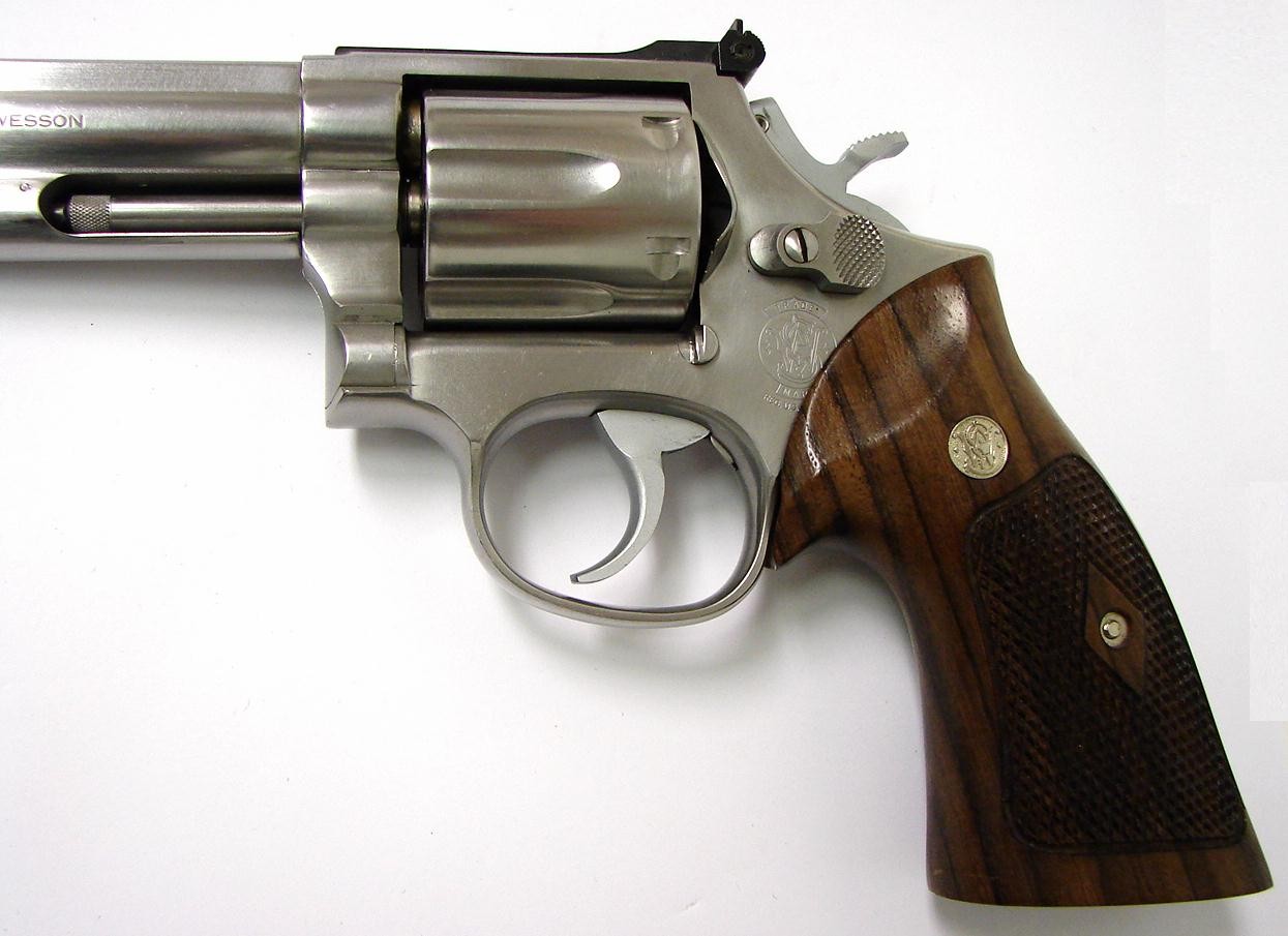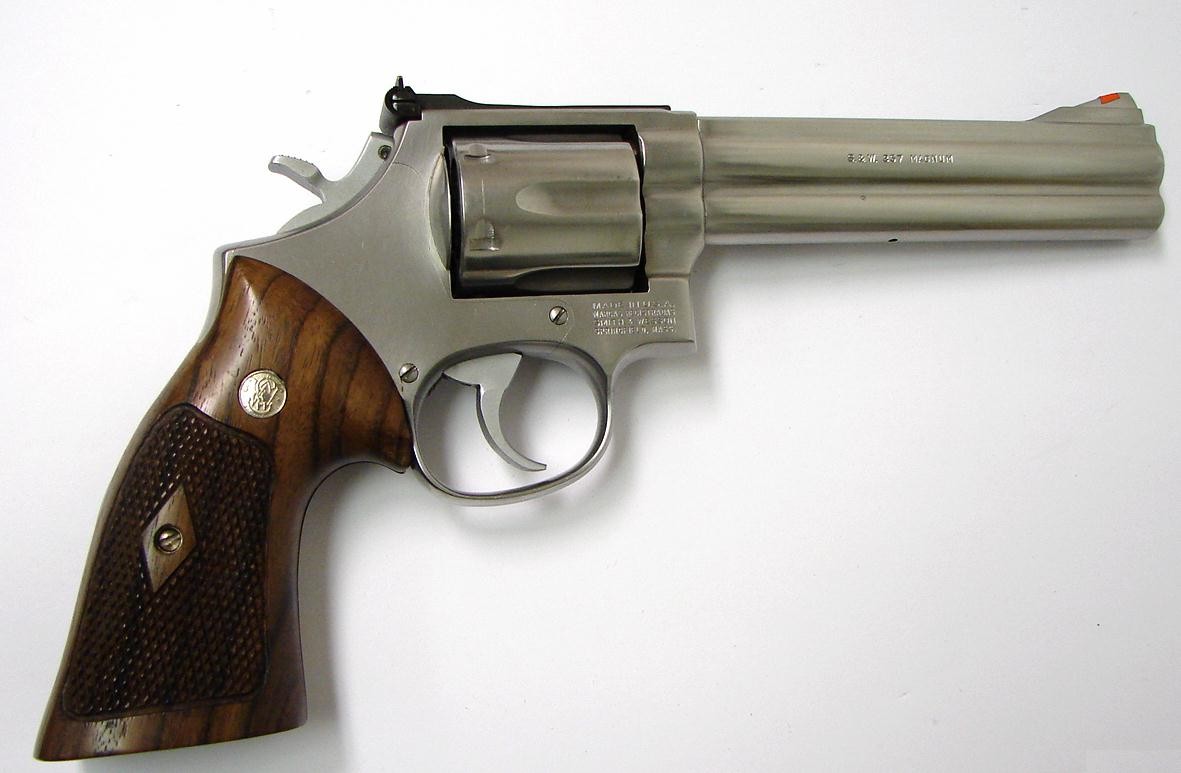 Smith & Wesson 686 .357 Magnum caliber revolver. 1980's vintage 6" model with 6-shot cylinder and wood grips. Near excellent condition.