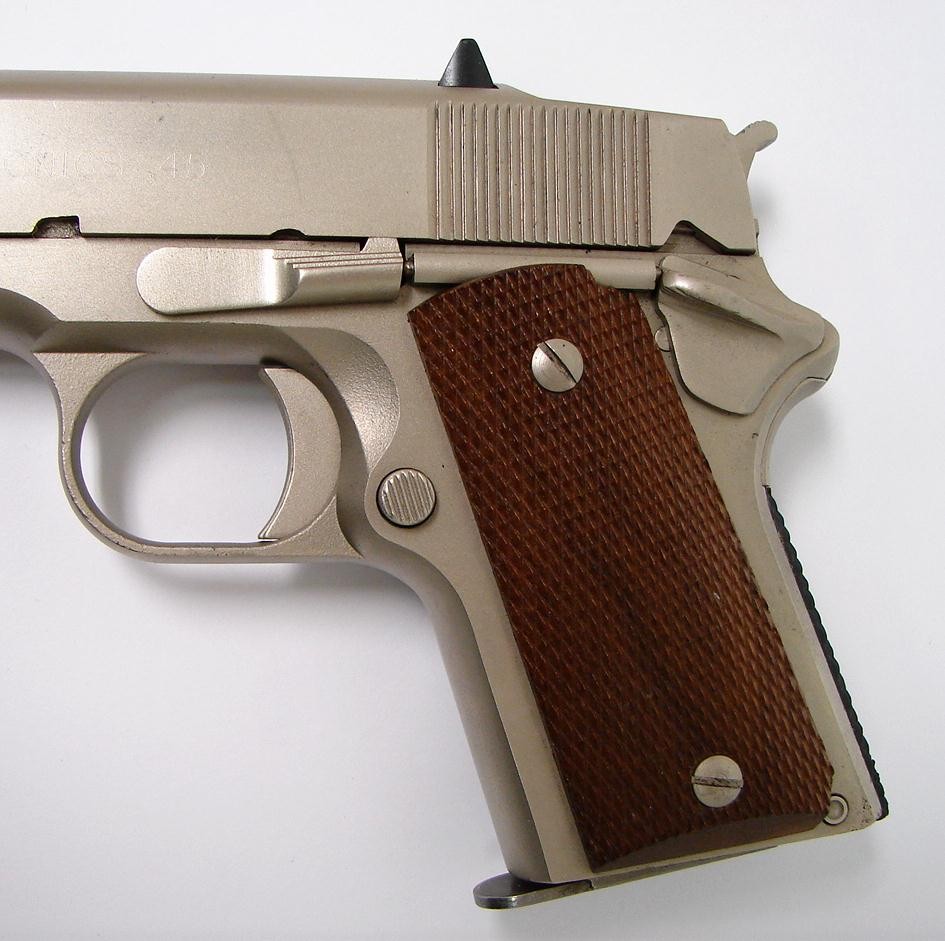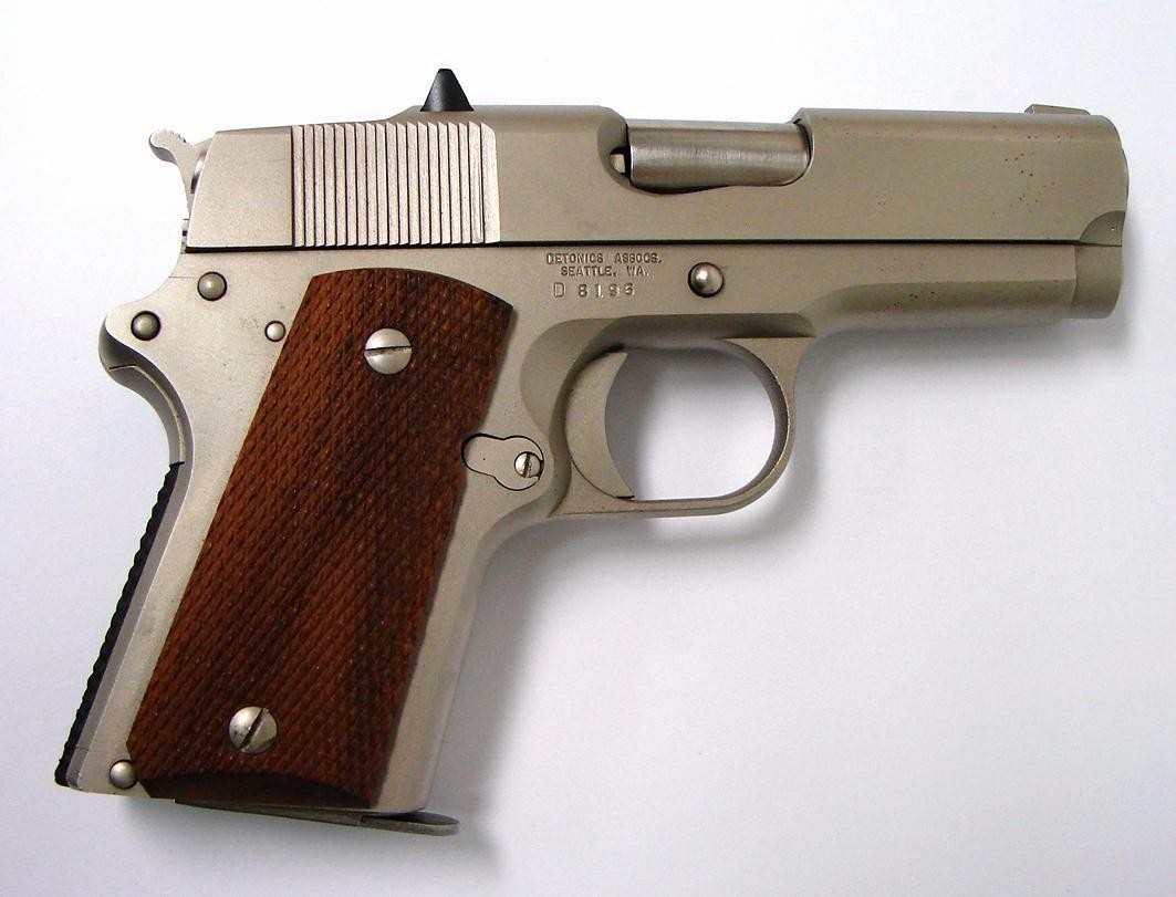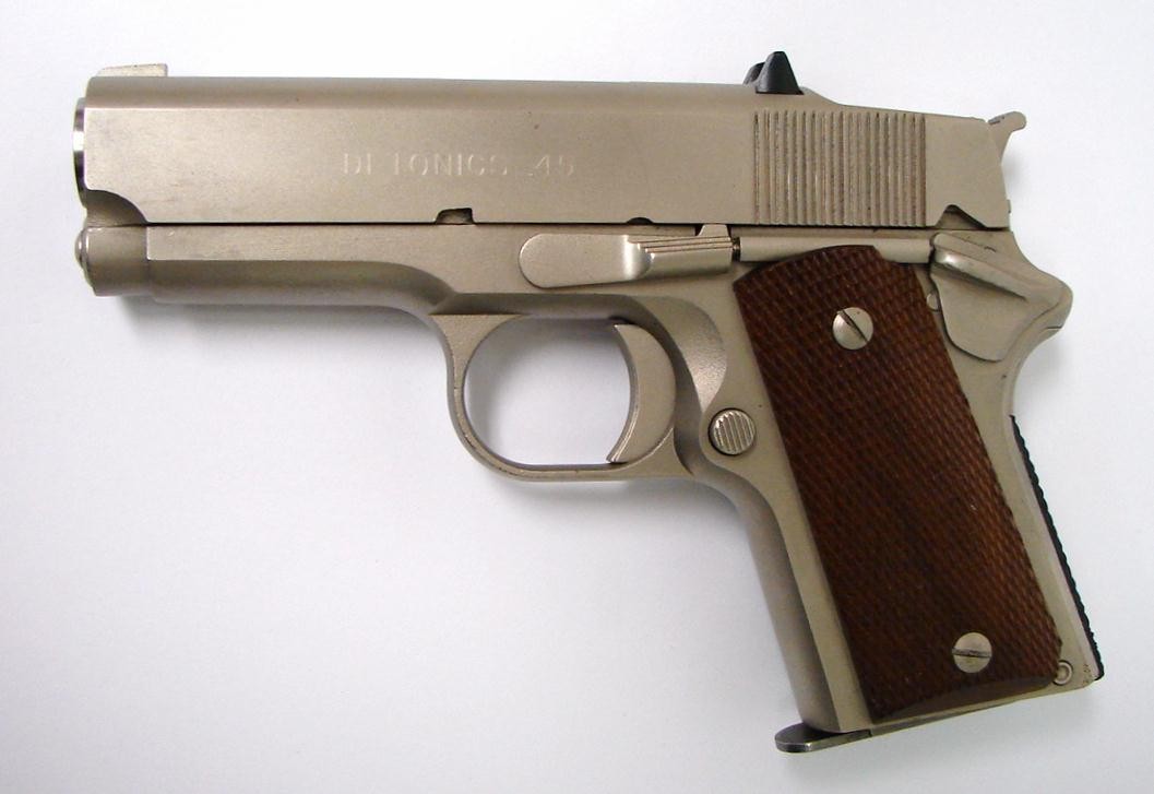 Detonics Combat Master .45 ACP caliber pistol. Original Seattle made subcompact with satin nickel finish and wood grips. Excellent condition.
