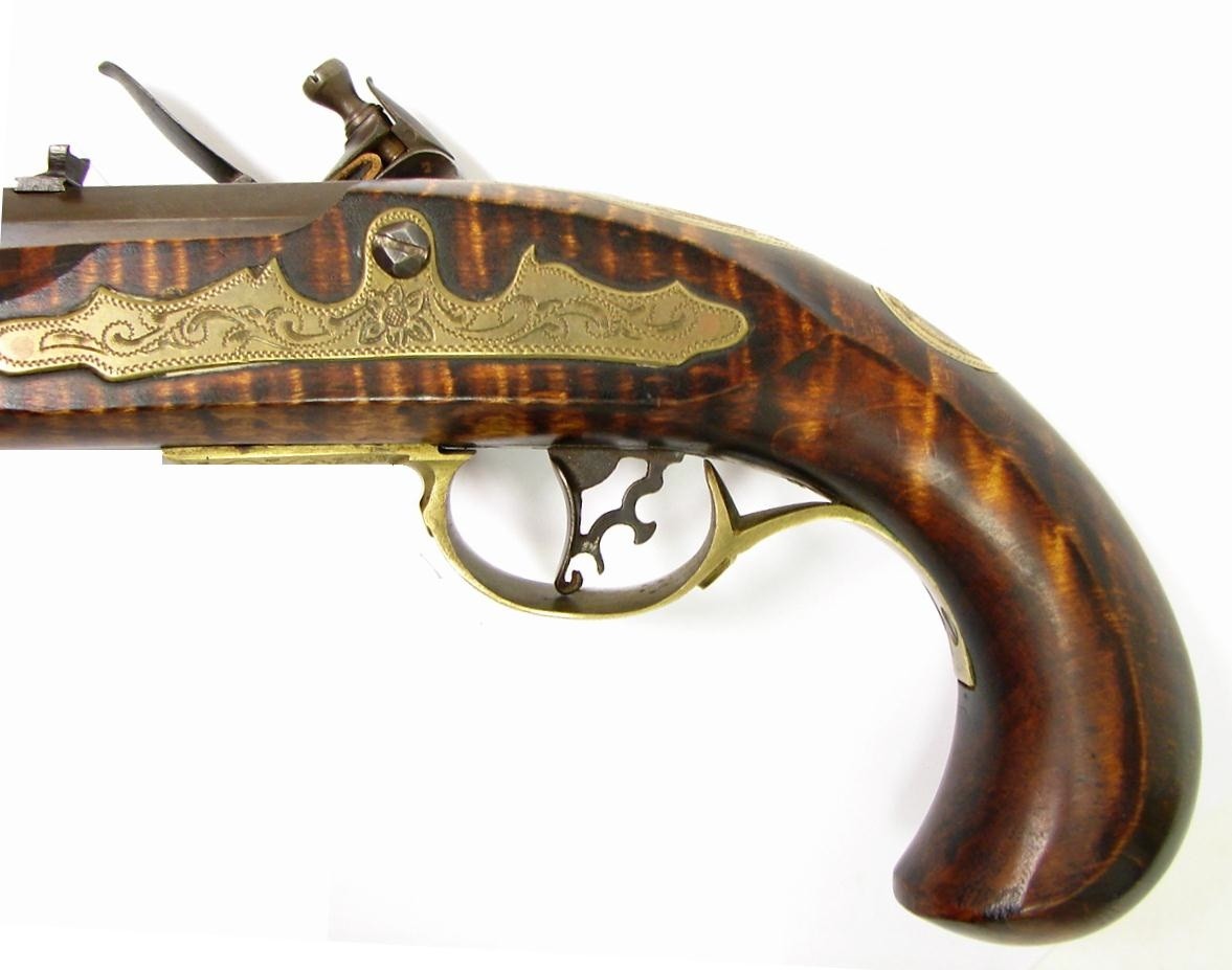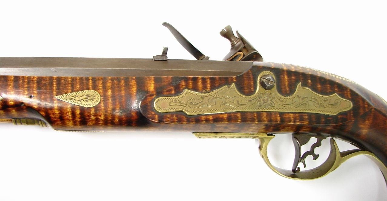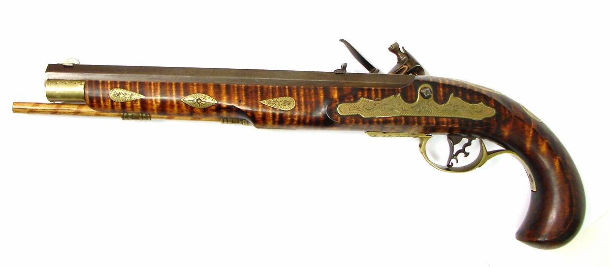 Kentucky Pistol .52 caliber (approximately) Contemporary Flintlock pistol by D. Davison. Lock is marked "Ashmore Warranted" all of the furniture is engraved. Stock is tiger stripe maple. This is a quality Kentucky flintlock. Barrel length 10" and 15" overall. Beautifully done modern Kentucky.