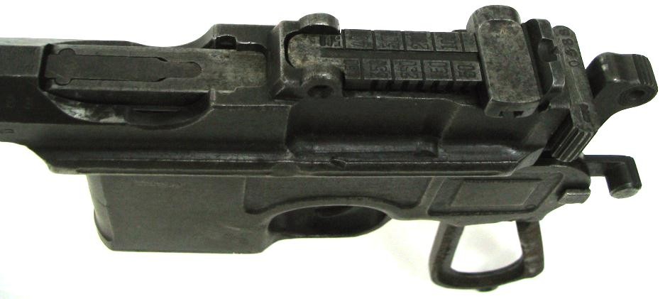 Mauser Red Nine 9mm caliber pistol with 50-500 sight (sight elevator needs plunger & spring). Needs grips and has a bulge at m (pr5116)