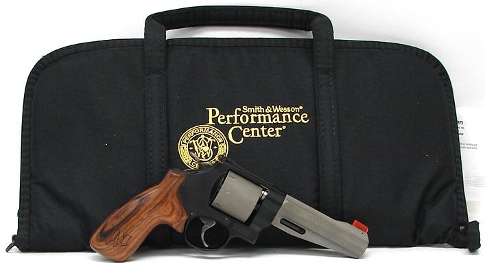 Smith & Wesson 327 PC .357 Magnum caliber revolver. Jerry Miculek Performance Center 8-shot lightweight model with Scandium frame and Titanium cylinder and barrel shroud. Has 5 barrel, Miculek smooth wood combat grips and 2 interchangeable front sights, one with fiber optic blade and one with gold bead. New.