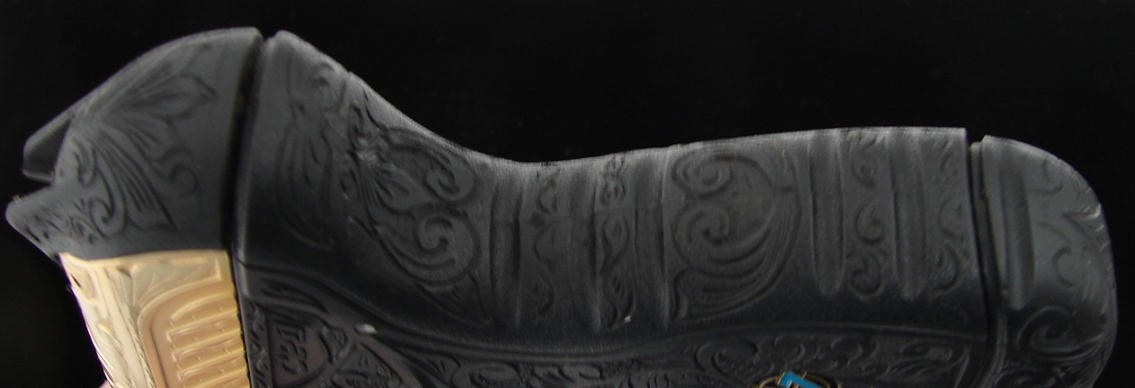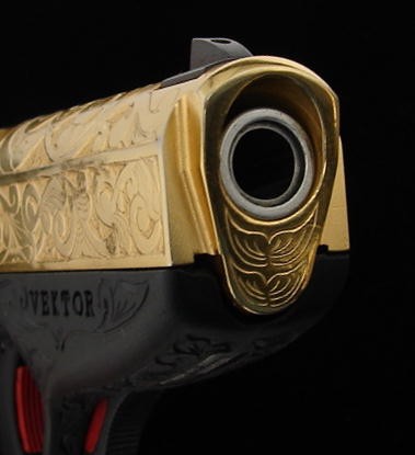 Vektor CP1 9mm caliber pistol. Scarce hi-tech South African pistol, custom engraved and gold plated. Has full coverage scroll on the metal and polymer, stylishly done.