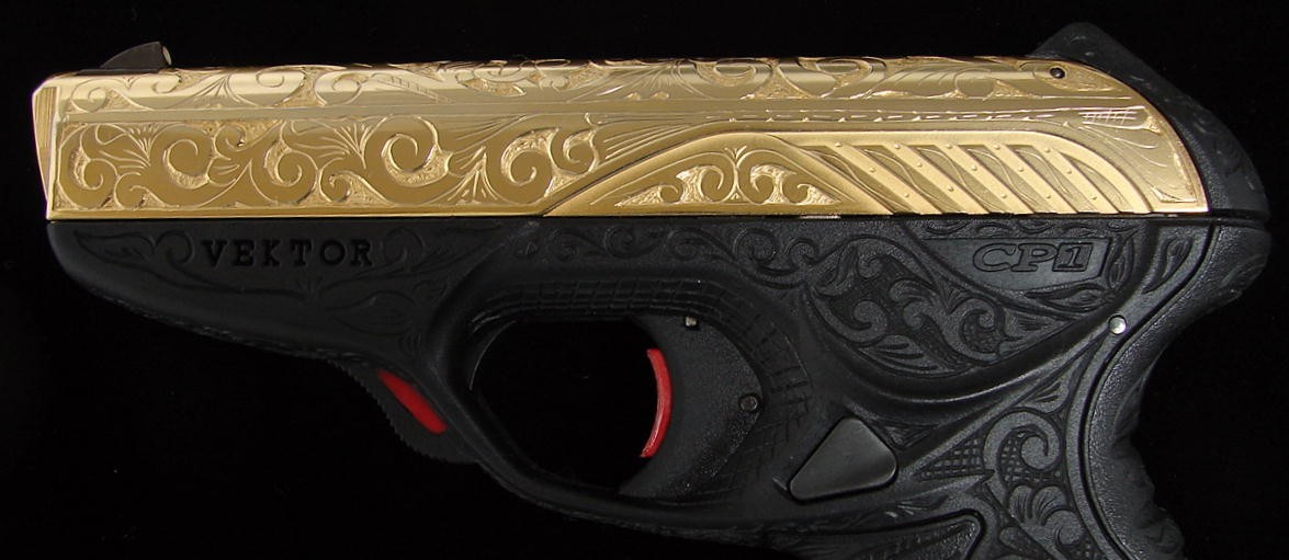 Vektor CP1 9mm caliber pistol. Scarce hi-tech South African pistol, custom engraved and gold plated. Has full coverage scroll on (pr8507)