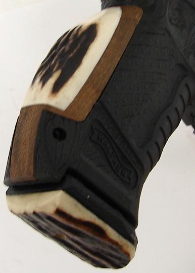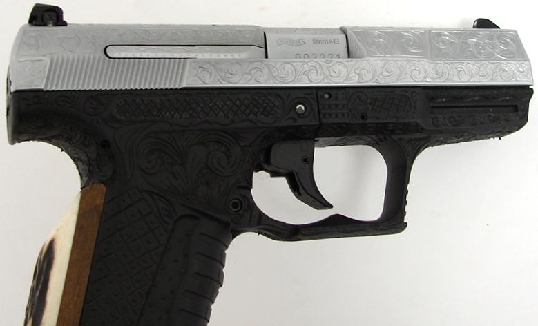 Walther P99 9mm caliber pistol. Extra fancy German auto with full coverage custom engraving, hard chrome finish and staghorn inlays on the grip and magazine. A very striking piece.