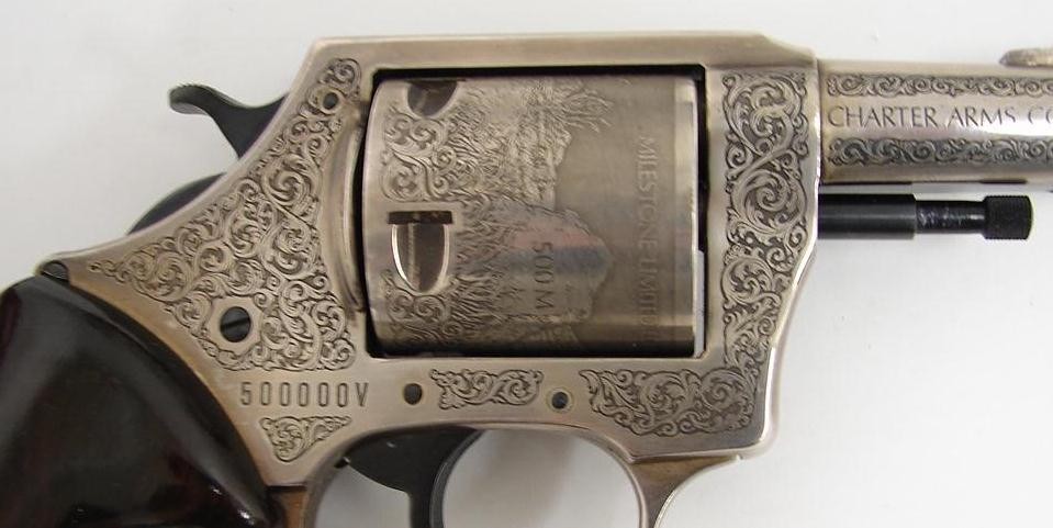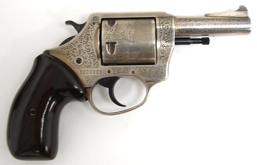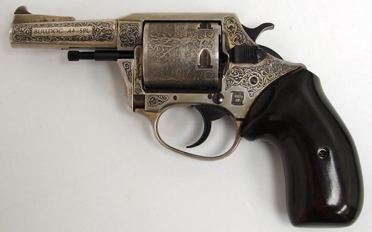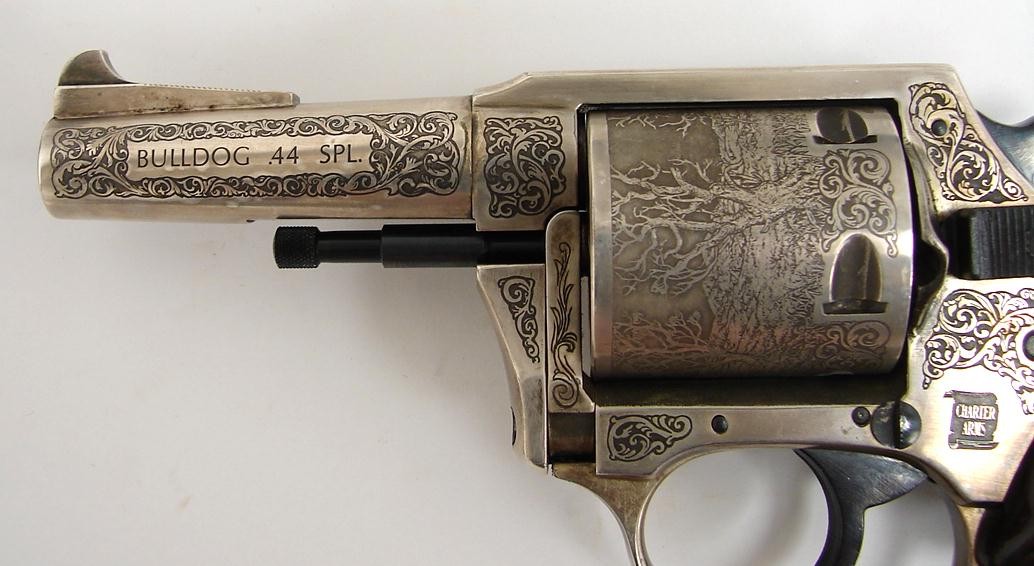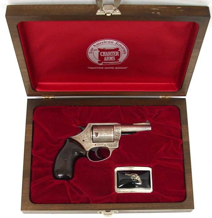 Charter Arms Bulldog .44 Special caliber revolver. 1 of 500 factory engraved revolver with special grips, belt buckle, display case and factory letter signed by David N. Ecker, president of Charter Arms Corporation. Milestone edition.